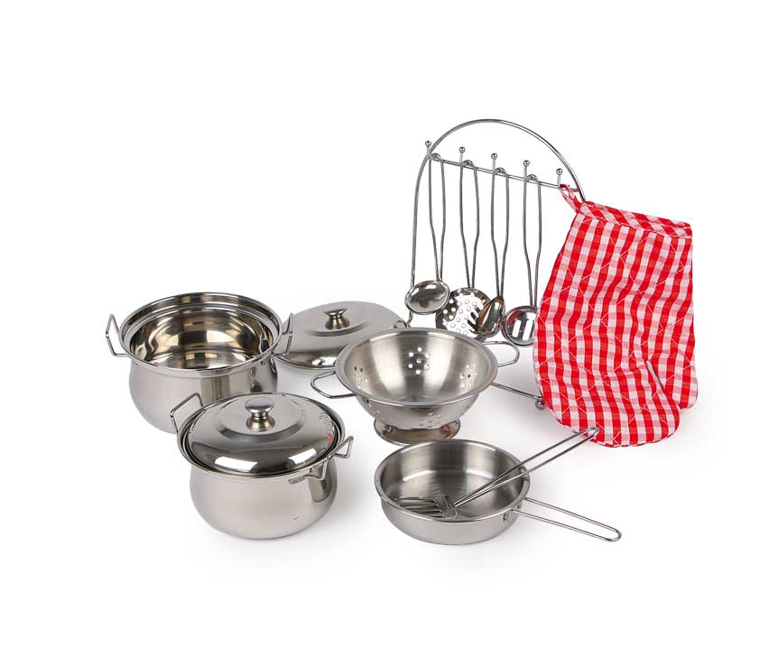 Mit diesem Kochgeschirr-Set aus verschiedenen Töpfen und Küchenutensilien wird jeder Tellerwäscher zum Spitzenkoch! Praktisch: Topfhandschuh und Ständer mit Küchenhelfern sind im Set enthalten.