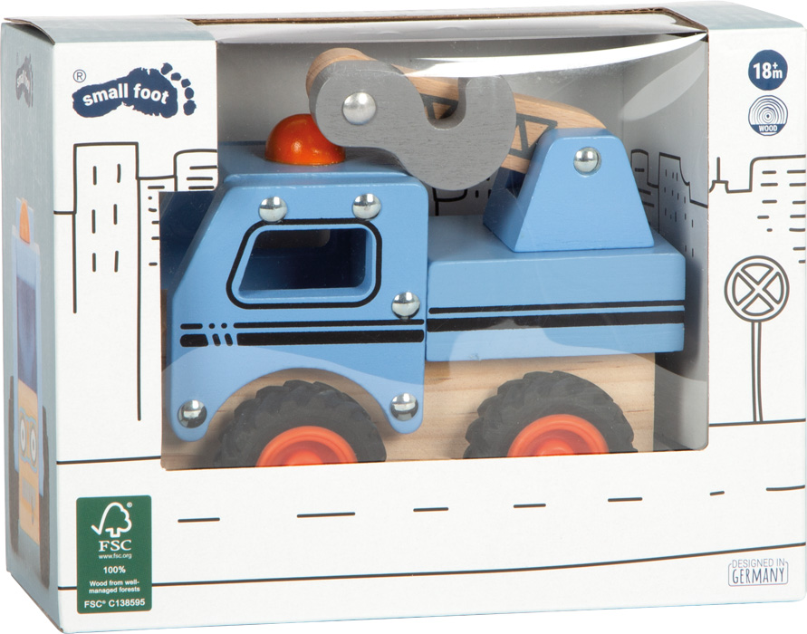Auf robusten, gummierten Rädern ist dieses Kranfahrzeug aus FSC® 100%-zertifiziertem Holz zur Stelle, wenn der nächste Abschlepp-Einsatz ansteht. Ausgestattet mit einem beweglichen Ladekran mit Haken, der als Abschleppvorrichtung fungiert, ist kreativer und realitätsnaher Rollenspielspaß im Kinderzimmer möglich. Dank der abgerundeten Kanten sowie der Fensteröffnungen ist das Holzfahrzeug auch für kleine Hände leicht zu greifen und zu bewegen.