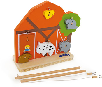 Wer angelt am schnellsten alle Bauernhoftiere? Bei diesem aufstellbaren Angelspiel aus Holz mit zwei Angeln und zwölf Spielfiguren geht es darum, gleichzeitig in Konkurrenz zu treten. Wer hat denn da eine Kuh geangelt?