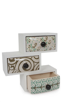 Dieses originelle weiße Holz-Schränkchen zur Aufbewahrung kleiner Kostbarkeiten besteht aus drei versetzt aufeinander gestapelten Schubladen-Elementen. Die Keramikschubladen sind mit formschönen Ornamenten in Lindgrün und Umbrabraun bemalt und werden von metallenen Stoppern im Schränkchen gehalten.