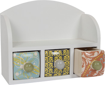 Ob kleine Schreibtischutensilien, Kosmetika oder Topfblümchen, dieses weiße Holzregal setzt Schönes und Nützliches in Szene. Die drei bunt bemalten Schubladen aus Keramik bieten Platz für Anspitzer und Büroklammern oder Lidschatten und Lippenstift. Kleine metallene Stopper verhindern ein Herausfallen der Schubladen.