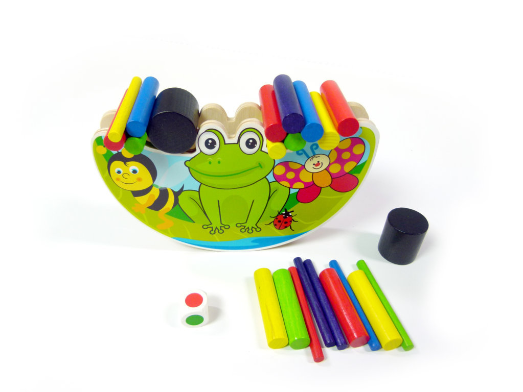 Buntes Balancierspiel mit Farbwürfel zum Stapeln aus Buche und Birkenleimholz.