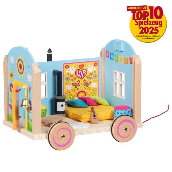 Die vor Lebensfreude strotzende, hippe Alternative zum Tiny- und Puppenhaus. Die gummiumreiften Holzräder machen ein grenzenloses Weiterziehen problemlos möglich. Das flexible Dach bietet den Komfort der perfekten Bespielbarkeit. Alle abgebildeten Ausstattungsgegenstände sind im Preis inbegriffen!