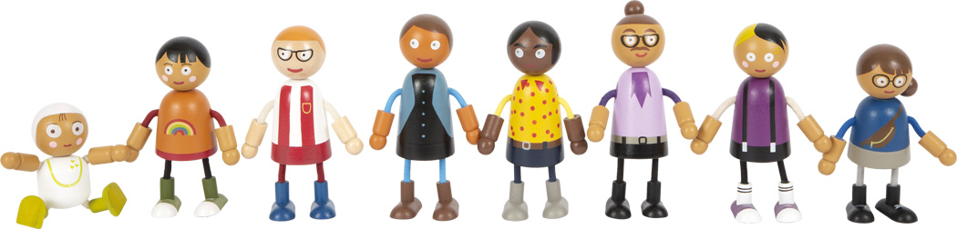Eine Patchwork-Familie fürs Puppenhaus! Diese Biegepuppen-Großfamilie aus Holz besteht aus 8 Familienmitgliedern unterschiedlichen Geschlechts und Alters. Die Biegepuppen verfügen über einen Kopf und Rumpf aus solidem Holz, während ihre biegsamen Arme und Beine jeder Rollenspielsituation im Puppenhaus gewachsen sind. Zwei Elternpaare sowie drei Kinder und ein Baby in einer Trage, die den Biegepuppen umgeschnallt werden kann, bieten dabei vielseitige Spielmöglichkeiten. Im aktiven Rollenspiel wird Kindern spielerisch vermittelt, wie vielfältig und bunt Lebensentwürfe und Familienkonstellationen sein können.
