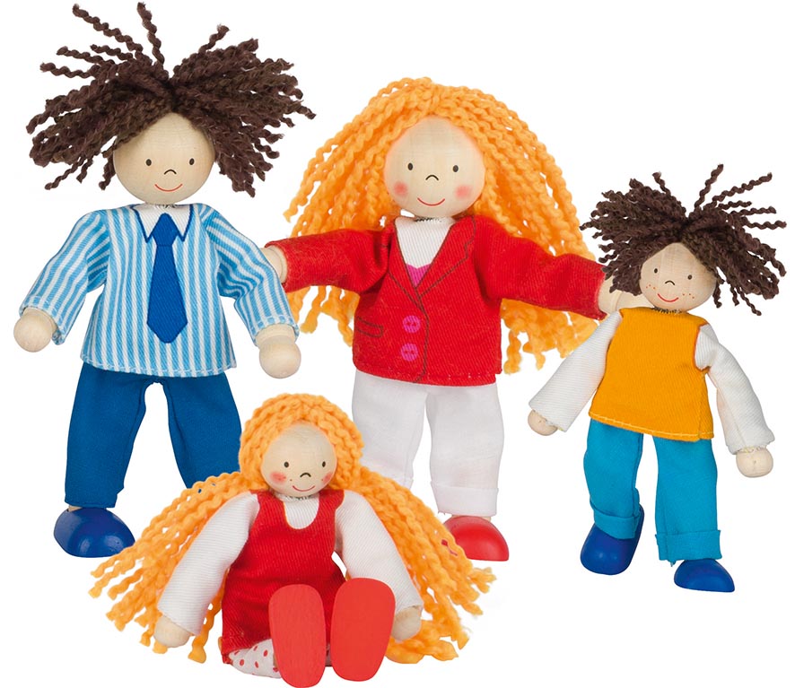 Die hölzernen Puppen sind leicht beweglich. Sie können sitzen und stehen und machen das Spielen so lebendiger. Sie passen zudem in alle goki-Puppenhäuser. Biegepuppen H= 9 - 11 cm