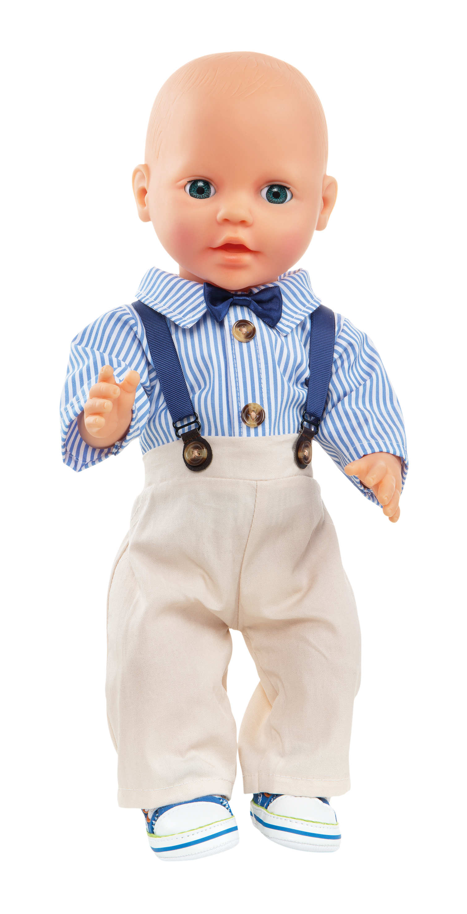 Der Puppen-Bräutigam kommt absolut modisch daher: mit authentischer Stoffhose, leicht verstellbaren stylishen Hosenträgern und flottem Streifenhemd. Die Fliege darf als Accessoire nicht fehlen und macht den hippen Gentlemen perfekt. Ein fantastisches Outfit, das zu jeder Festlichkeit getragen werden kann. Dieses Outfit passt den meisten marktgängigen Puppen der Größe 28 - 35 cm. Es ist auch in einer weiteren Ausführung für Puppengröße 35 - 45 cm erhältlich. Der Artikel wird auf einem Holzkleiderbügel geliefert.