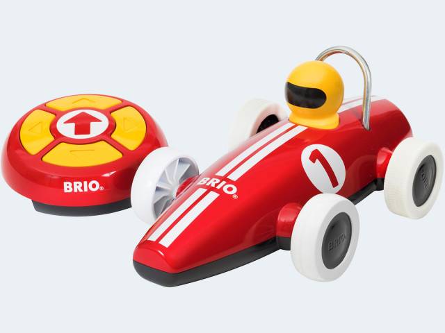 Mit seinem leuchtend roten Fahrwerk und seinem windschnittigen Aussehen bietet der BRIO RC Rennwagen mit Fernsteuerung den Kindern viele Stunden rasanten Rennfahrspaß.