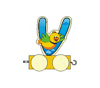 Farbiger Buchstabe aus Birkenleimholz auf Rädern, farblich sortiert.