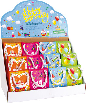 12 Stück. Ein kleiner, origineller Geburtstagsgruß: Die Spieluhr spielt den weltweit bekannten Klassiker „Happy Birthday“. Sie ist hübsch verpackt in einer bunten Papiertüte mit praktischem Henkelband. Ein süßes Mitbringsel als Ergänzung zum großen Geschenk, als Gutschein oder einfach nur so als „Ich-denk-an-dich“ für Geburtstagskinder jeden Alters.