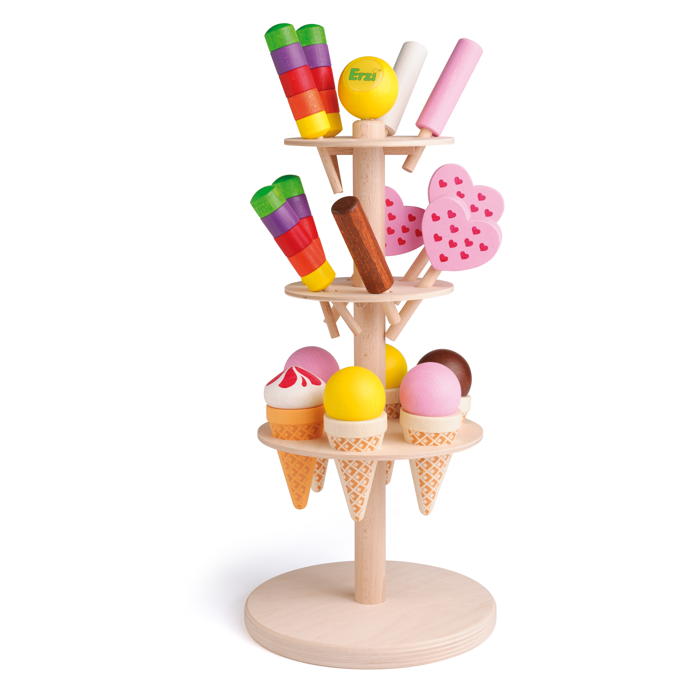 Display zum dekorativen Präsentieren der Erzi Eissorten.