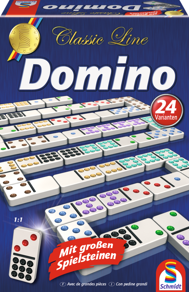 Der Klassiker mit chinesischen Wurzeln und klösterlicher Abstammung verschafft in dieser hochwertigen Variante mit 55 großformatigen Dominosteinen und 24 Spielregelvarianten höchstes Spielvergnügen. Schön zum Anfassen, schön zum Spielen.