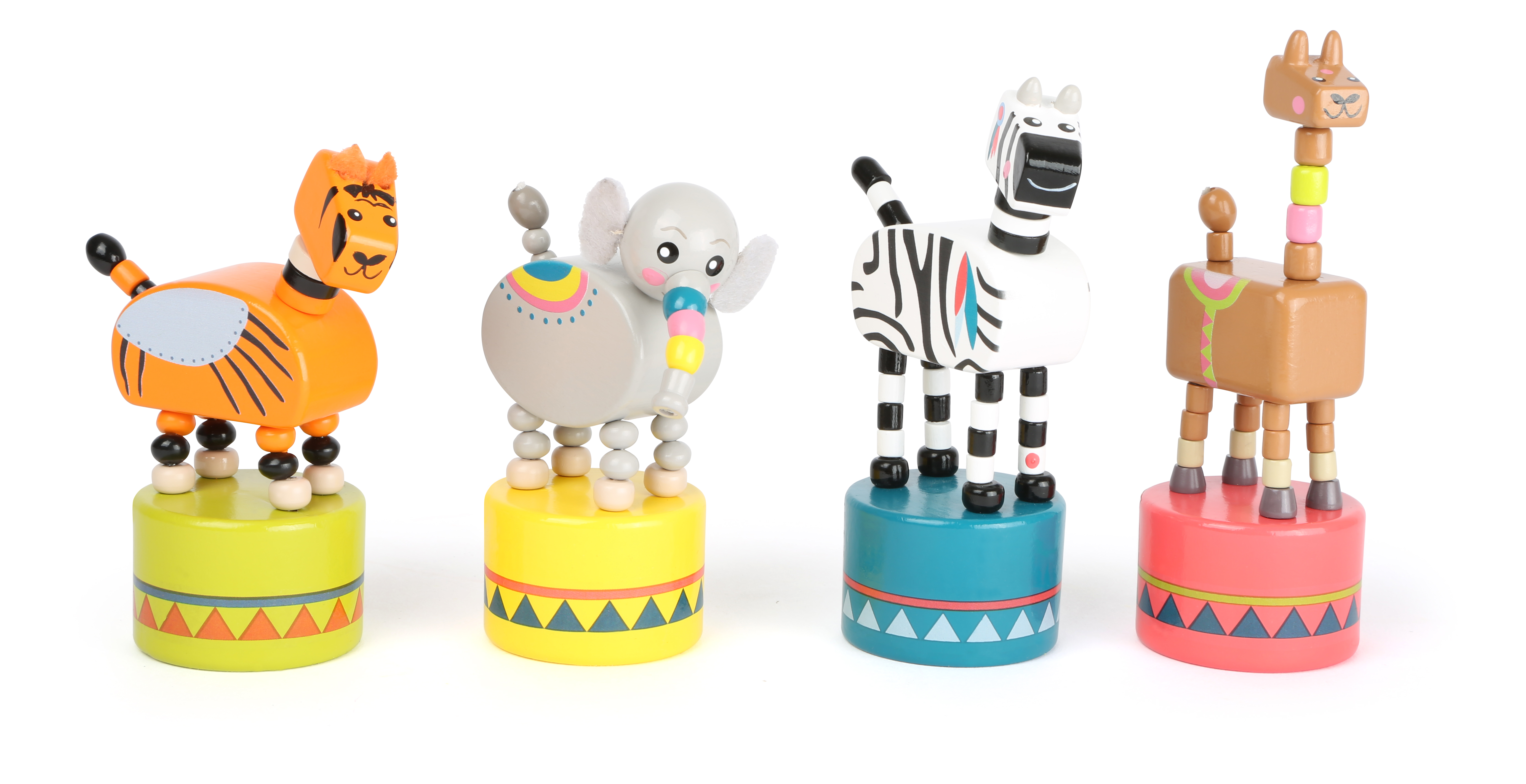 Lasst die Wildtiere tanzen! Lama, Elefant & Co stehen auf ihren Podesten und warten nur darauf, bewegt zu werden. Einfach unter das Podest drücken und es entstehen lustige und immer wieder neue Bewegungen und wilde Tänze. Durch das farbenfrohe Design sind die Drücktiere aus FSC® 100%-zertifiziertem Holz als Deko- und Sammelartikel sehr beliebt.