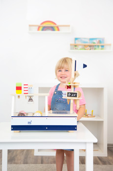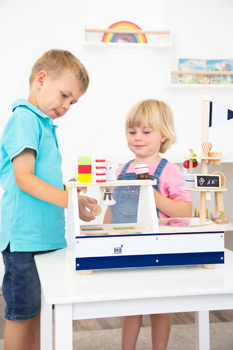 Auf zur Eisdiele! Dieses Eis-Spielset aus Holz macht das sommerliche Rollenspiel perfekt. Die in Blau-, Rosa- und Naturholztönen gehaltene Eistheke überzeugt als Auftischverkaufsstand mit vielen Funktionen und umfangreichem Zubehör. Stapelbare Eiskugeln, Stieleis, Sahnehaube/Softeis, Eiswaffeln und -becher mit Löffeln sowie Herzchenwaffel und Dekokirsche lassen keine Wünsche offen. Die Eisauslage mit Kunststoffscheibe, das Gefrierfach mit transparentem Drehdeckel inkl. Anschlagsbegrenzung, der Zubehörständer und das Aufbewahrungsfach sorgen für Ordnung am Eisstand! Highlights sind der magnetische Eisportionierer und der Softeis-/Sahnespender.Inkl. Tafelschild zum Beschriften. Die Eiskugeln (Vanille, Schoko, Stracciatella und Erdbeere) können nach Belieben mit dem Eiskugelportionierer mit Hilfe von Magneten aus der Auslage genommen werden und auf die jeweilige Waffel oder in den Becher mit einem Druck auf den Wippengriff platziert werden. Die vorbestimmten Positionen der Eiskugeln werden durch die farblich abgestimmten Fächer vorgegeben. Zwei der vier Eiskugeln und die Sahne bzw. das Softeis können mit der Herzchenwaffel oder der Kirschdekoration bestückt werden. Die Eiskugeln lassen sich nach Belieben stapeln. Mit dem Sahne-/Softeisspender können die Kugeln oder Waffeln/ Becher mit einer Sahnehaube oder Softeis versehen werden. Ein Druck auf den Taster genügt und die Sahne bzw. das Softeis löst sich vom Spender. Ein kleines Fach unter der Auslage kann für die Aufbewahrung von eigenem Zubehör oder ergänzendes Spielzeug wie Spielgeld und Geldbörse verwendet werden.