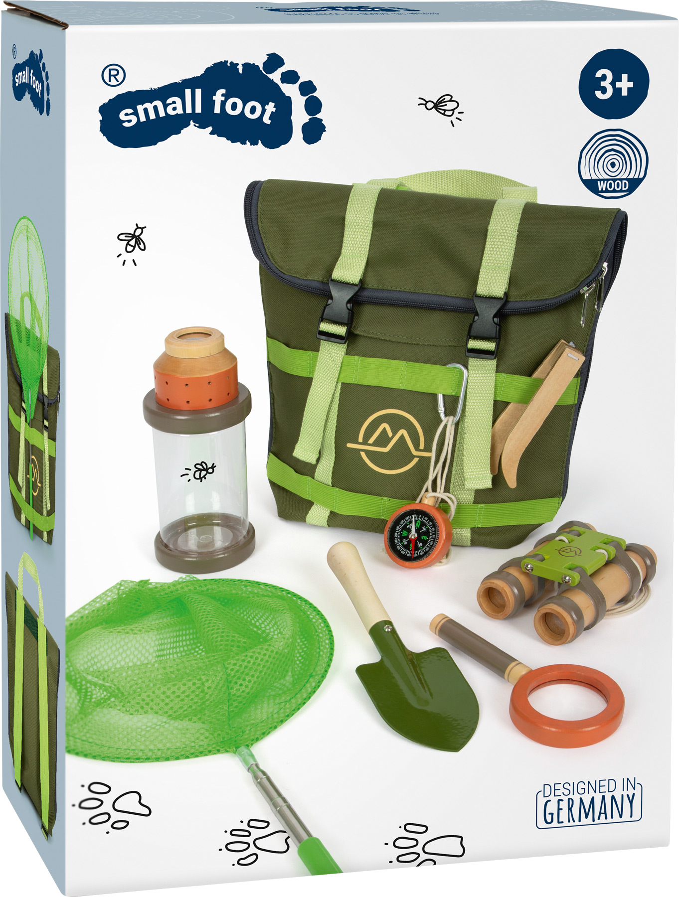Inhalt: 1 Rucksack, 1 Insektenglas mit integrierter Lupe, 1 Holzfernglas, 1 Kescher mit Teleskoparm, 1 Kompass mit Trageband, 1 Lupe mit Vergrößerungsfunktion, 1 Pinzette, 1 Schaufel, 1 Karabiner