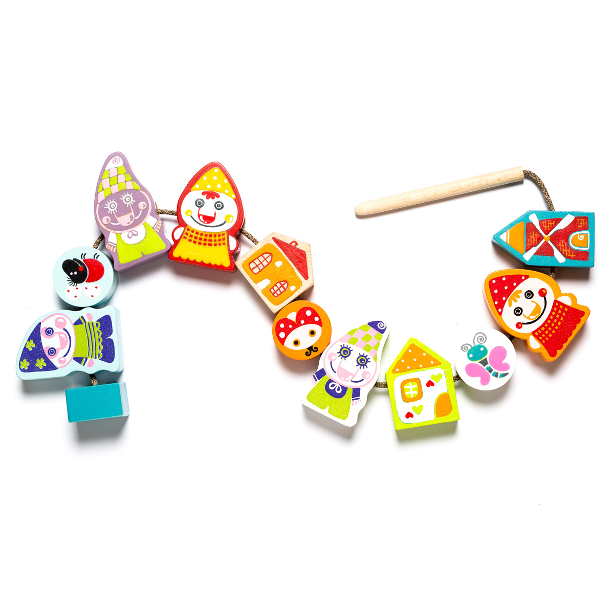 Das Fädelspiel «Fröhliche Zwerge» besteht aus 13 bunten Zwergenfiguren, Häusern und Schmetterlingen und einem Seil mit einer hölzernen Spitze zum einfachen Auffädeln in einer bestimmten Reihenfolge oder nach den 8 Aufgabenkarten. Entwickelt Konzentration, Geschicklichkeit, Feinmotorik und Aufmerksamkeit.