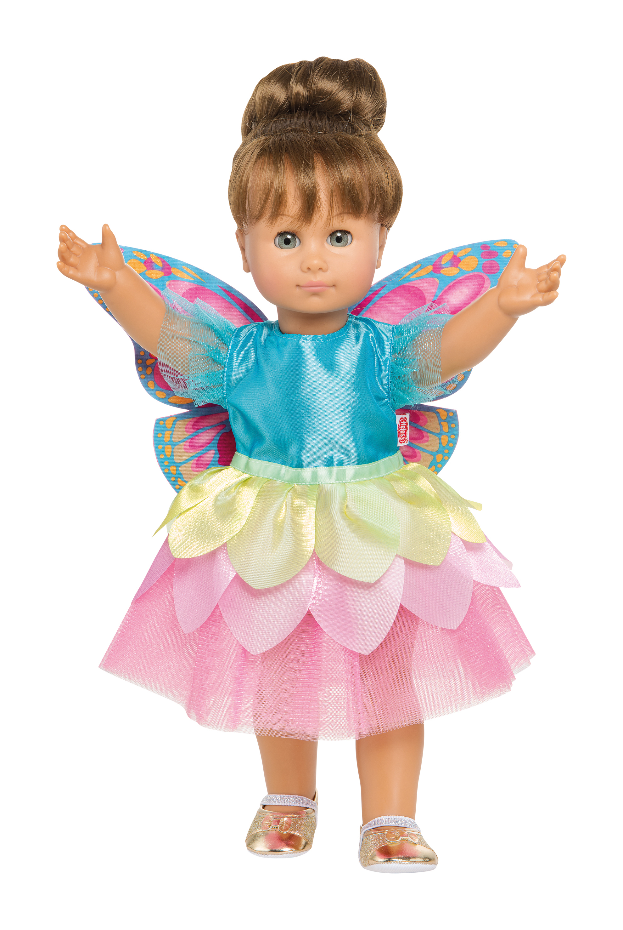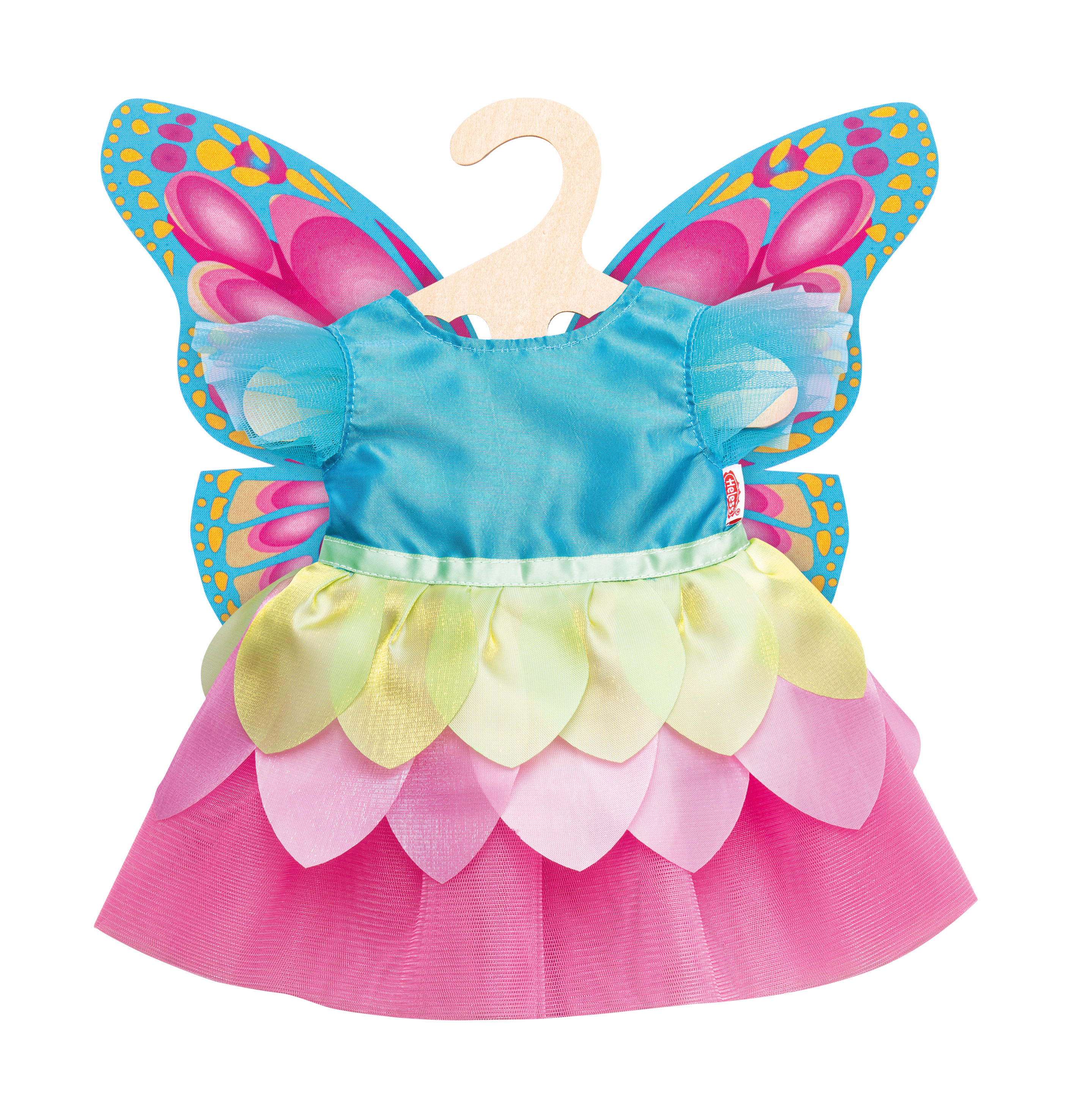 Wie im Märchen schimmert das traumhaft schöne Feenkleid „Schmetterling“ von Heless in den prächtigsten Farben. Der hübsche mehrlagige Tüllunterrock ist aufwendig bedeckt mit schimmernden Stoffen in liebevoller Blütenform. Ein edles Satinband trennt den pastelligen Rock vom Oberteil in kräftigem Hellblau-Petrol, so dass ein wunderschöner Farbkontrast entsteht. Die fantasievollen, am Rücken befestigten Flügel verleihen der Puppenfee die Anmut eines hinreißenden Schmetterlings. Das farbenberauschende und filigrane Design ist perfekt auf das Kleid abgestimmt und lassen die Puppe erstrahlen. Ein märchenhaftes Kleid, das Kinder in magische Traumwelten eintauchen lässt. Dieses Kleid passt den meisten marktgängigen Puppen der Größe 28 - 35 cm. Es ist auch in einer weiteren Ausführung für Puppengröße 35 - 45 cm erhältlich. Der Artikel wird auf einem Holzkleiderbügel geliefert.
