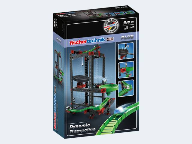 Erstmals können fischertechnik Kugelbahnen mit einem Trampolin erweitert werden. Die Kugel fällt auf das Trampolin und springt in den Kreiseltrichter. Mit diesem Bausatz kann ein actionreiches Modell gebaut werden, das sich hervorragend dazu eignet auch in andere Kugelbahnen eingebaut zu werden. Für alle fischertechnik Kugelbahn Fans gibt es auf der fischertechnik Homepage eine kostenlose Bauanleitung, die beschreibt, wie das Trampolin in den Dynamic M Baukasten eingebaut werden kann. Darüber hinaus sind der Kreativität für den Einbau des Trampolins in alle anderen fischertechnik Kugelbahnen keine Grenzen gesetzt. Grenzenloser Spielspaß ist garantiert!