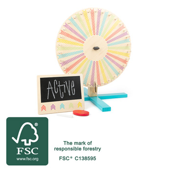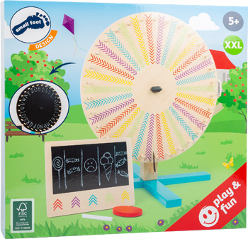 Jeder Dreh gewinnt! Das Glücksrad aus FSC® 100%-zertifiziertem Holz kommt mit einer wendbaren Drehscheibe daher, die sich leicht umrüsten lässt. Die Scheibe ist auf der einen Seite mit 30 Farbfeldern, auf der anderen mit Tafellack versehen. So kann immer wieder eine eigene neue Einteilung vorgenommen werden. Auf der kleinen Tafel können die Teams oder Namen notiert werden, um am Schluss den Gewinner zu küren! Das Glücksrad ist ideal für lustige Spielrunden im Kinderzimmer, Gewinnspiele im Kindergarten oder auf dem Kindergeburtstag!