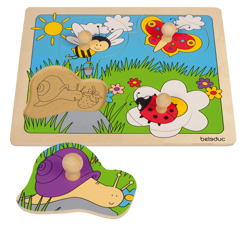 Die großen Knöpfe erleichtern es den Kleinsten, die Puzzleteile zu greifen. Die leuchtenden Farben und die erkennbaren Designs ziehen die Aufmerksamkeit auf sich und regen die Kinder zum Entdecken an.