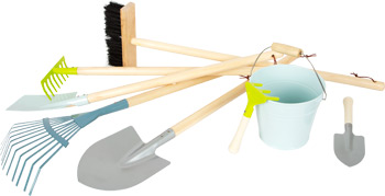 Dieses umfangreiche Gartenwerkzeug-Set in modernen Farben besteht aus Spaten, Schaufel, Rechen, Harke, Besen, Eimer und zwei kleinen Gartengeräten und bietet für jede Tätigkeit das passende Equipment. Nach der Arbeit können die Werkzeuge aus robustem Holz und Metall an den praktischen Schlaufen ordentlich aufgehängt werden. Die Gartenarbeit ruft! Ein echtes „Muss“ für alle kleinen Gartenhelfer, das auch optisch ein Hingucker ist.