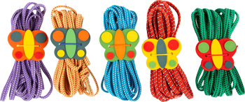 Bunte Gummibänder mit dekorativem Halter. Der Hüpfspaß fördert Geschicklichkeit und Fitness. Das wussten schon unsere Großeltern. Eine weitere Ausführung des Dauerklassikers Gummitwist! 5er Set