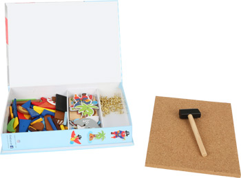 Mit diesem Hämmerchenspiel lassen sich verschiedene Piratenmotive auf ein Korkbrett hämmern. Vier Karten machen Motivvorschläge, wie ein Bild aussehen kann. Verpackt in einer Schachtel ist es gut aufzubewahren.