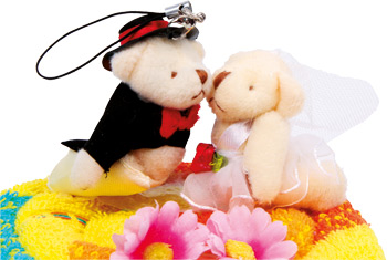 Wie eine bunte Leckerei sieht dieses gefaltete Handtuch aus! Inkl. einem Teddy-Brautpaar mit Hängeschlaufe an kleinem Karabiner als niedliche Zierde.