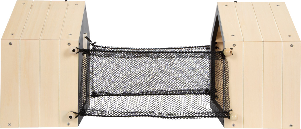 Eine Hasenhütte für das Plüsch-Langohr! Die Doppelhütte aus stabilem Holz, die auch als Transportkäfig genutzt werden kann, besteht aus zwei mit Kugeln und Schlingen zusammenknüpfbaren Häuschen: In dem einen Teil kann der Kuschelhase schlafen und ist durch eine magnetisch schließende Klappe ungestört, auf der anderen Seite kann das Häschen durch ein Mesh-Gewebe nach draußen schauen. Zwei Gehege-Zäune aus Mesh lassen sich zwischen die Stallteile knüpfen, sodass ein Außengehege entsteht. Inkl. Plüschkaninchen, Bürste, Napf, Möhre aus Holz und Filz sowie Salatblatt und Kaninchenkötteln aus Filz.