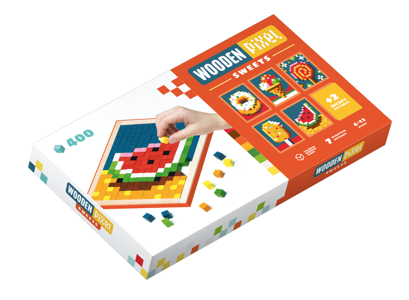 Das Holzmosaik besteht aus bunten Würfeln, mit denen Sie 7 verschiedene Bilder zum Thema "Süßigkeiten" gestalten können. Für 5 Bilder gibt es eine Anleitung und 2 weitere sind versteckt und werden für ein Kind erst dann verständlich, wenn das ganze Bild vollständig zusammengesetzt ist. Das Set besteht aus 400 kleinen Holzwürfeln, 1 Holzrahmen und 1 farbigen Kartonrahmen.