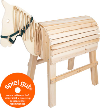 Ein Holzpferd ist das schönste Geschenk für alle Pferdefans! Kleine und große ReiterInnen erlernen mit diesem großen Spiel-, Reit- und Voltigierpferd aus unbehandeltem, witterungsbeständigem Holz spielerisch Grundlagen über Pferde, Ponys und das Reiten kennen. Mähne und Schweif aus Sisal laden zum Frisieren und Flechten ein und eine Trittstufe macht das Aufsteigen für die Kleinsten kinderleicht. Ausgestellte Beine sorgen für sicheren, stabilen Stand. Einzigartig: Hinter der Klapptür am Hinterteil verbirgt sich ein großer Stauraum im Pferdebauch, in dem Halfter, Putzzeug und Zubehör Platz finden. Inkl. Halfter! Ideal für den Garten oder das Kinderzimmer! Der Pferderücken ist von der Größe her so konzipiert, dass echte Sättel und Sitzkissen passen. Für eine langlebige Nutzung kann das unbehandelte Holz mit einer Holzschutzlasur farblich an die eigenen Bedürfnisse angepasst werden.