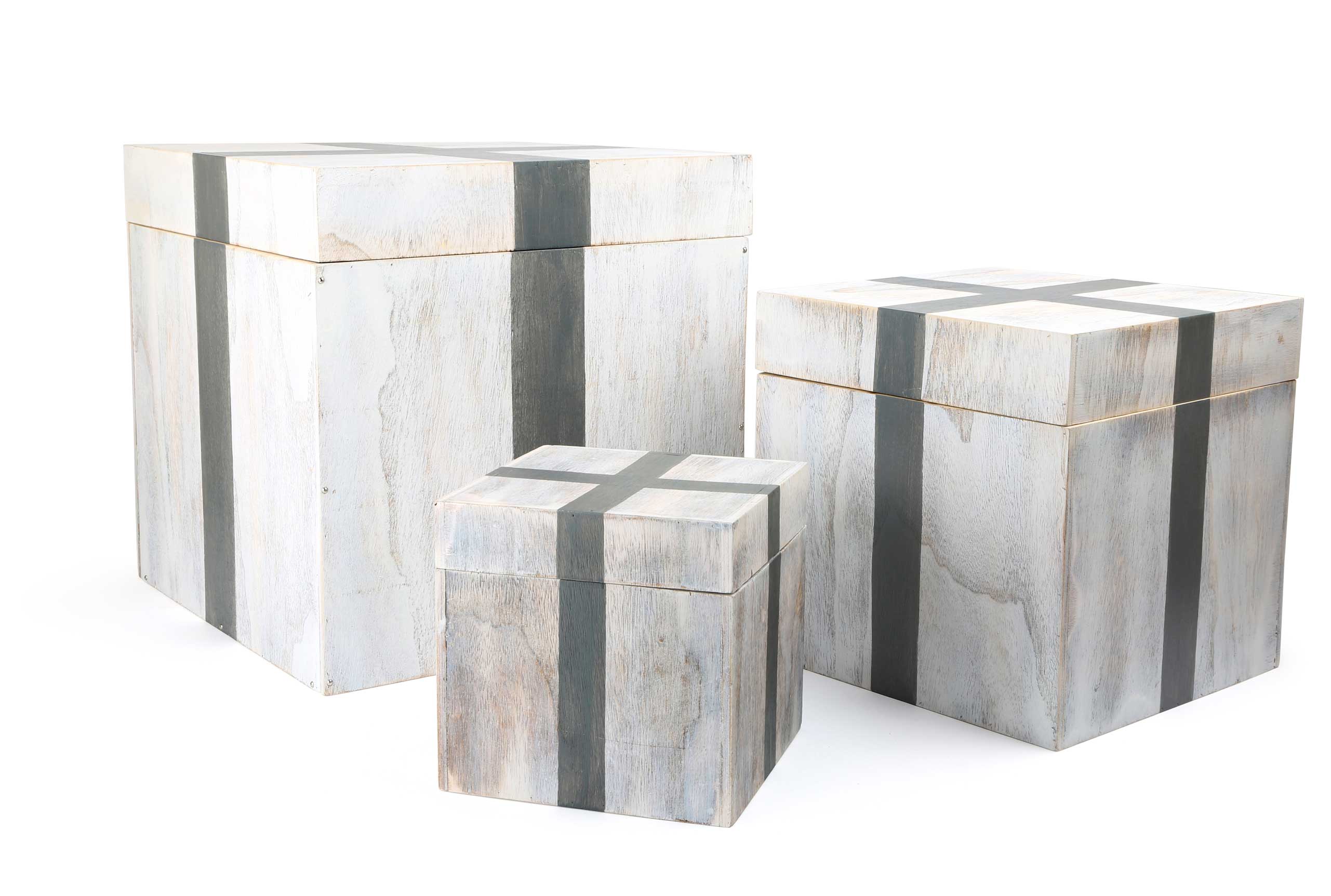 Drei Holztruhen der besonderen Art. Optisch sehen sie schon aus wie ein verpacktes Geschenk. In drei verschiedenen Größen kann jedes Präsent wunderbar mit dem aufklappbaren Deckel verstaut werden. Auch als Aufbewahrungsmöglichkeit ein echter Hingucker.