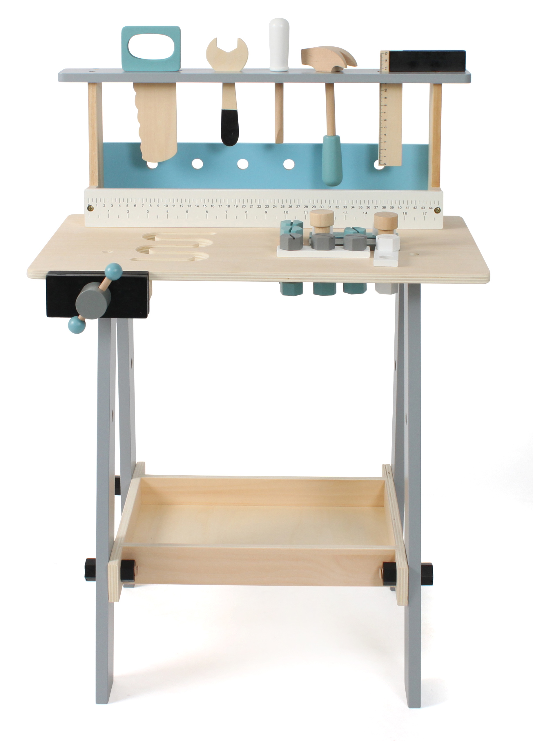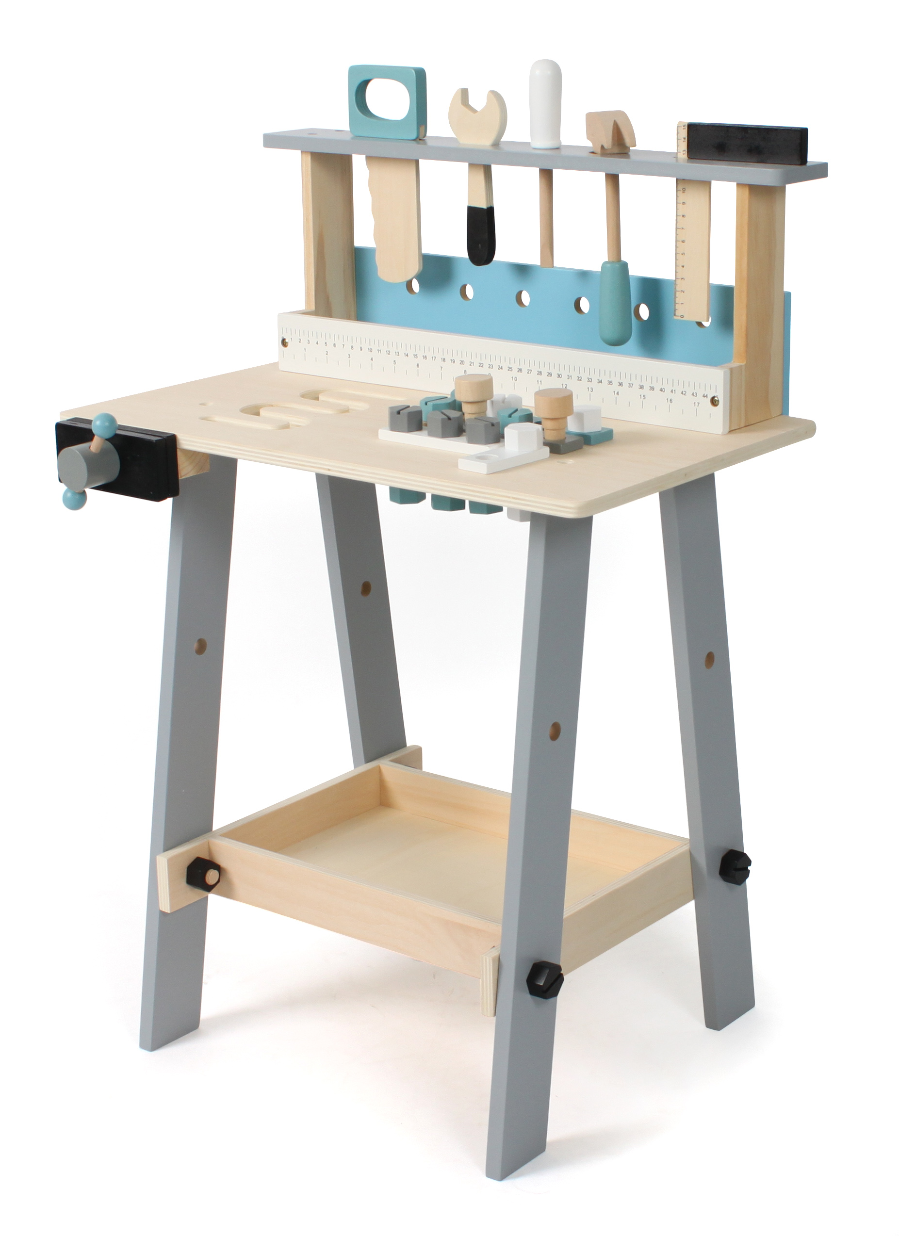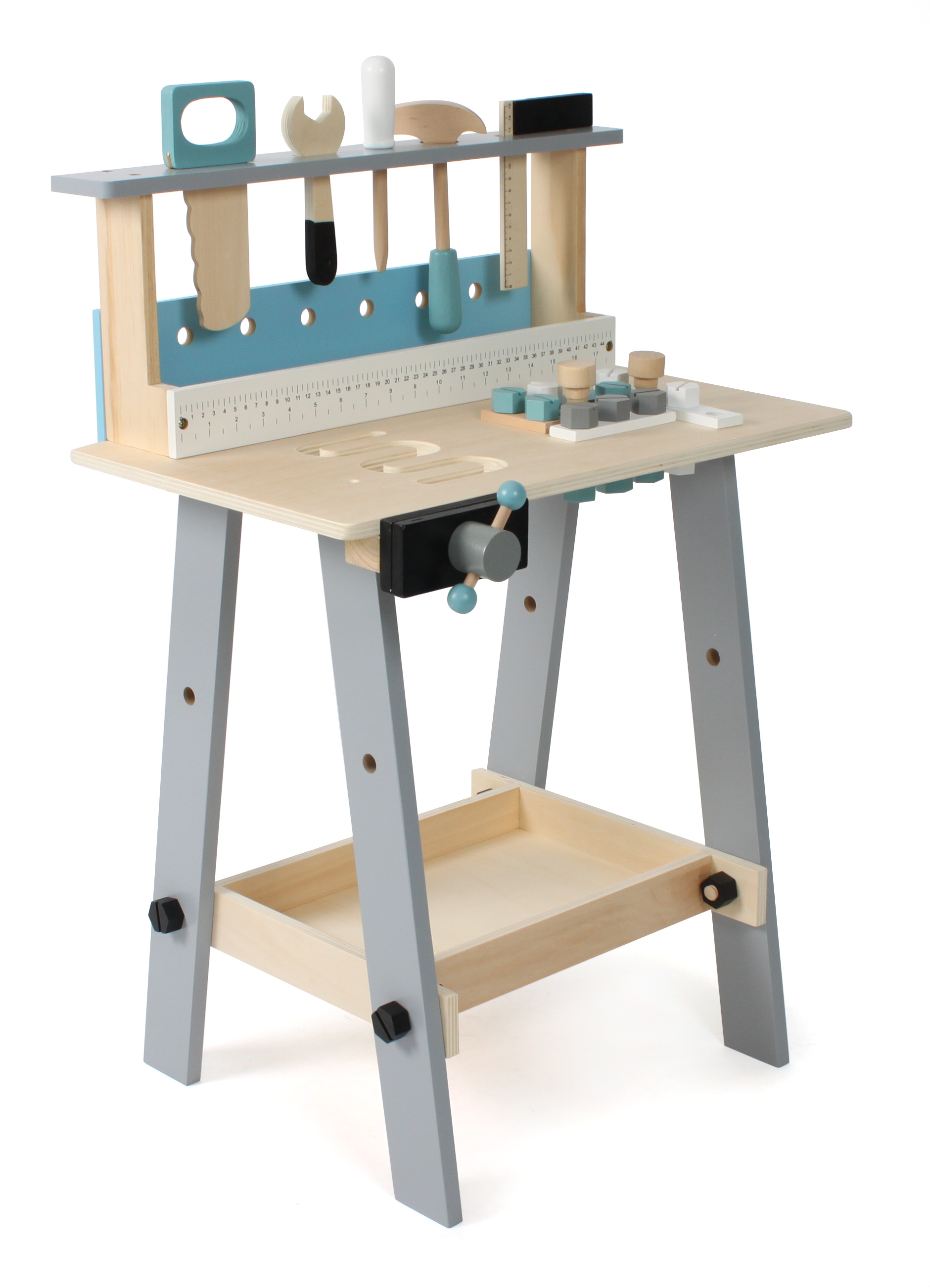 Kleine Handwerker werden von dieser Holzwerkbank begeistert sein, denn sie ist den echten zum Verwechseln ähnlich und super ausgestattet. Die große Arbeitsfläche mit Maßangabe und Schraubstock bietet jede Menge Platz, um Werkstücke präzise herzustellen. Durch die Löcher können Schrauben und Muttern in Tisch und Rückwand befestigt werden. Das Zubehör umfasst einen Schraubendreher, einen Hammer, einen Maulschlüssel, eine Säge, ein Lineal sowie Schrauben, Muttern und Verbindungselemente. Nötiger Stauraum wird im großen Ablagefach geboten. Artikelmaße 53 x 33 x 74 cm, Gewicht: 4,2 kg