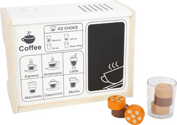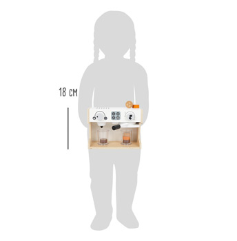 Mini-Baristas aufgepasst! Mit dieser pfiffigen Profi-Kaffeemaschine aus Holz gelingt in der Kinderküche garantiert der perfekte Kaffee. Für realistisches Spielvergnügen sorgen zwei Drehknöpfe mit Klickgeräusch und ein beweglicher Siebträger, der bei Betätigung den "Kaffee" in die transparenten Kaffeebecher befördert. Dabei können sogar verschiedene Kaffeespezialitäten zubereitet werden! Auf der Rückseite befindet sich eine beschreibbare Tafel und eine Erklärung der verschiedenen Kaffeesorten. Ein moderner Kaffeeautomat mit Milchaufschäumer als Hingucker und perfekte Ergänzung für die Spielküche! Kaffeetrinken wie Mama und Papa! Die Siebträgermaschine fördert nicht nur das aktive Rollenspiel, sondern auch die motorischen Fähigkeiten. Mit der Kaffeemaschine können Kinder die Alltagsrituale ihrer Eltern nachspielen und dabei soziale Kompetenzen erlernen. Den nächsten Frühstückskaffee macht garantiert der Nachwuchs!