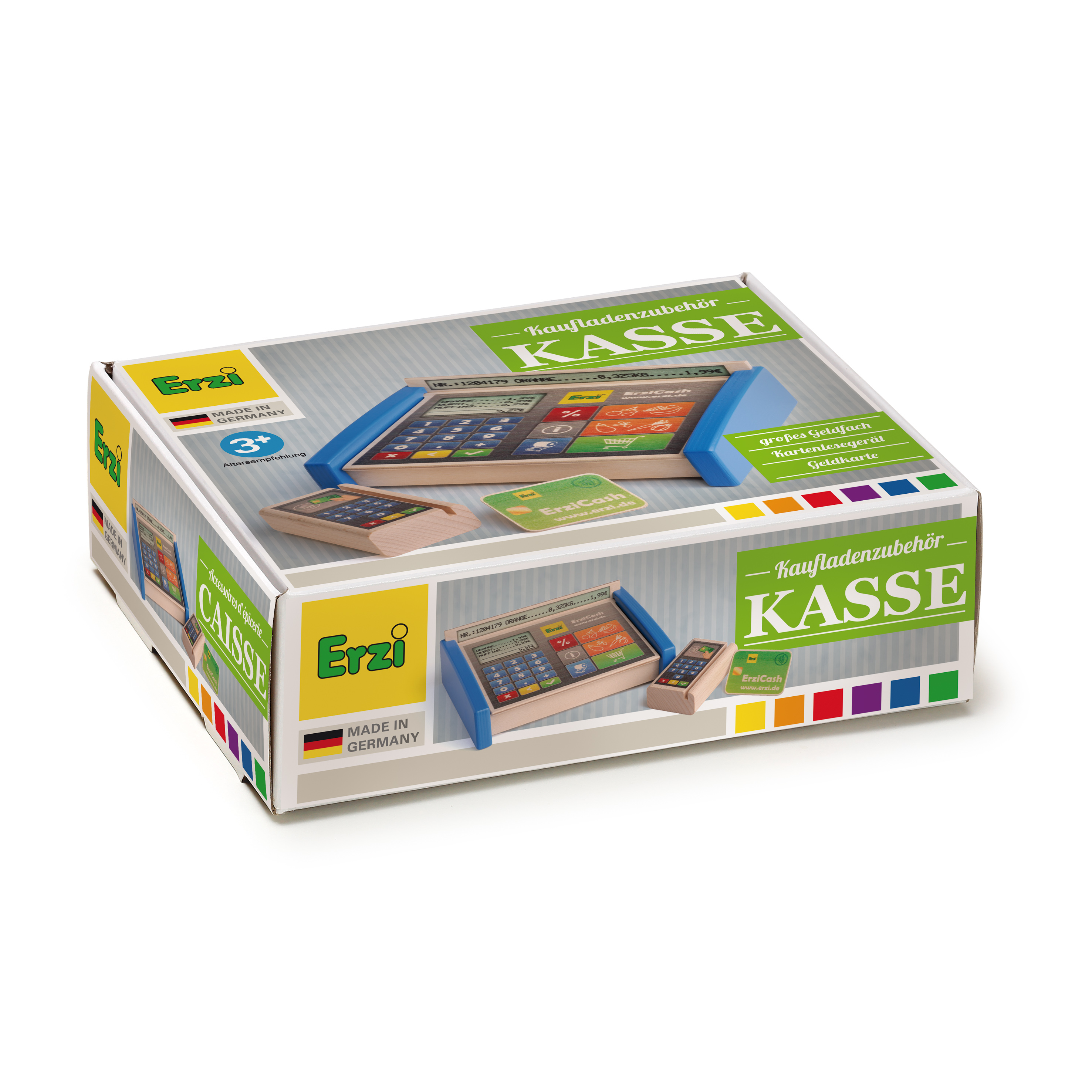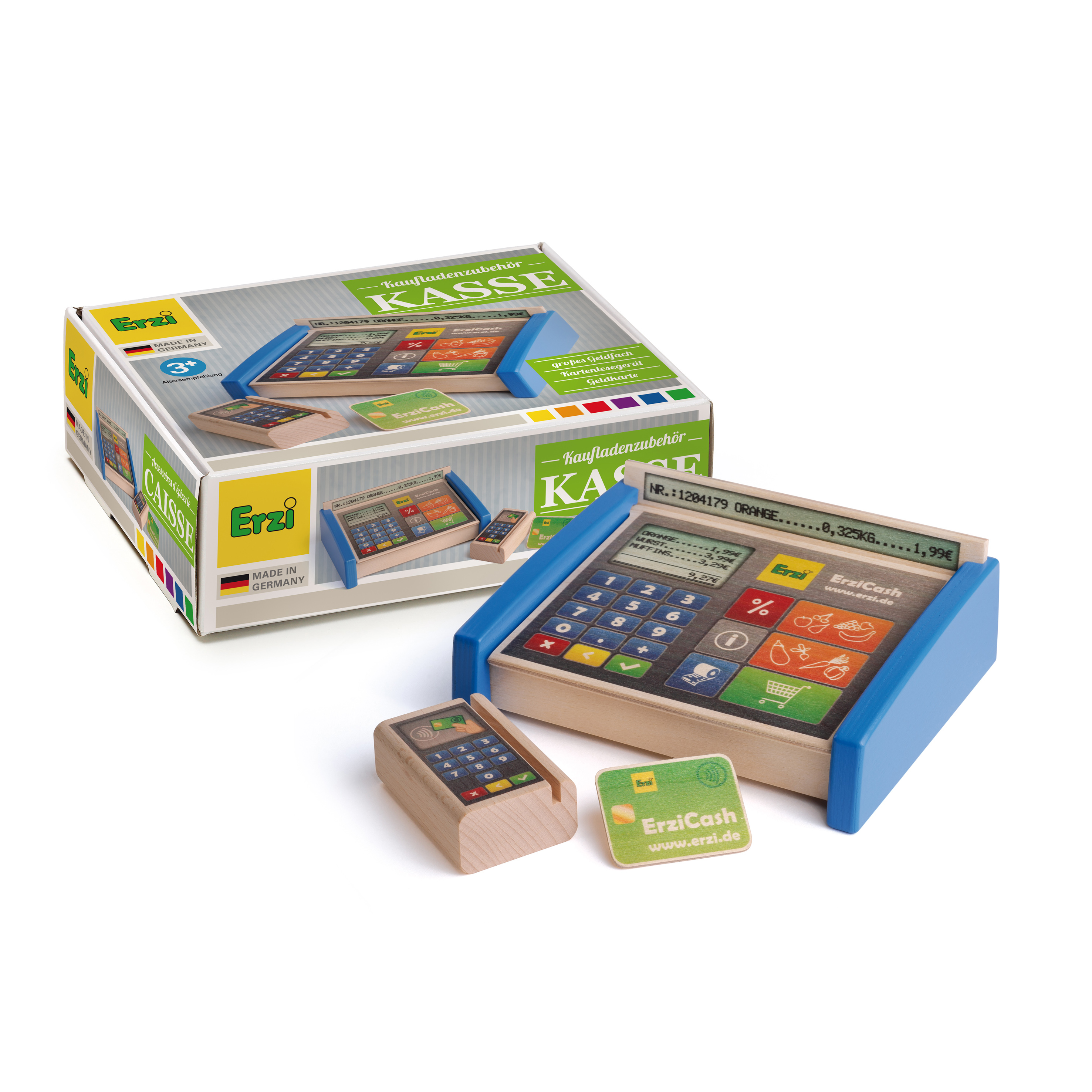 Unverzichtbar beim Spiel im Kaufladen: Die moderne farbenfrohe Kasse aus Holz mit großem, gedruckten "Touchpad", einer Anzeige und einem geräumigen Fach für Spielgeld. Das separate EC- Kartenlesegerät bietet die Möglichkeit, die mitgelieferte Karte durchzuziehen oder aber - ganz aktuell - nur aufzulegen. Das machen die Kinder ganz wie die Großen. Beim Umgang mit Geld und Zahlen werden geistige und motorische Fähig- und Fertigkeiten spielerisch geschult.