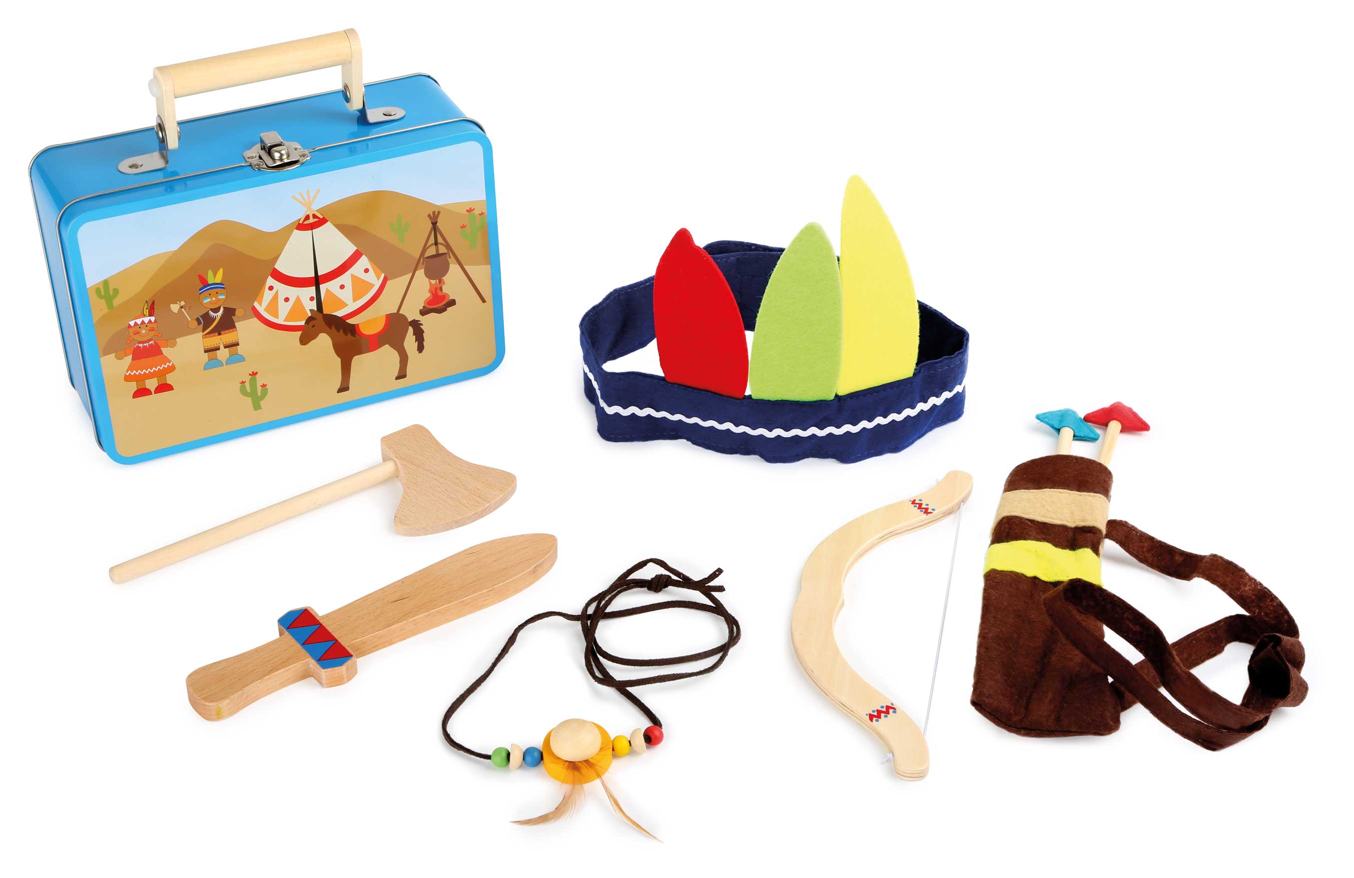 Wild, wild West! Ein Metallkoffer mit perfekter Verkleidung für einen originalen Indianer. Winnetou würde vor Neid erblassen! Für die Kopfbedeckung sorgt ein Filzband mit Verzierung und drei bunten Federn. Pfeil und Bogen sind in einem Filzbeutel untergebracht, und Axt und Messer mit Lederbändern und bunten Perlen verziert. Um das Indianer-Outfit abzurunden, darf eine Indianerkette natürlich nicht fehlen.