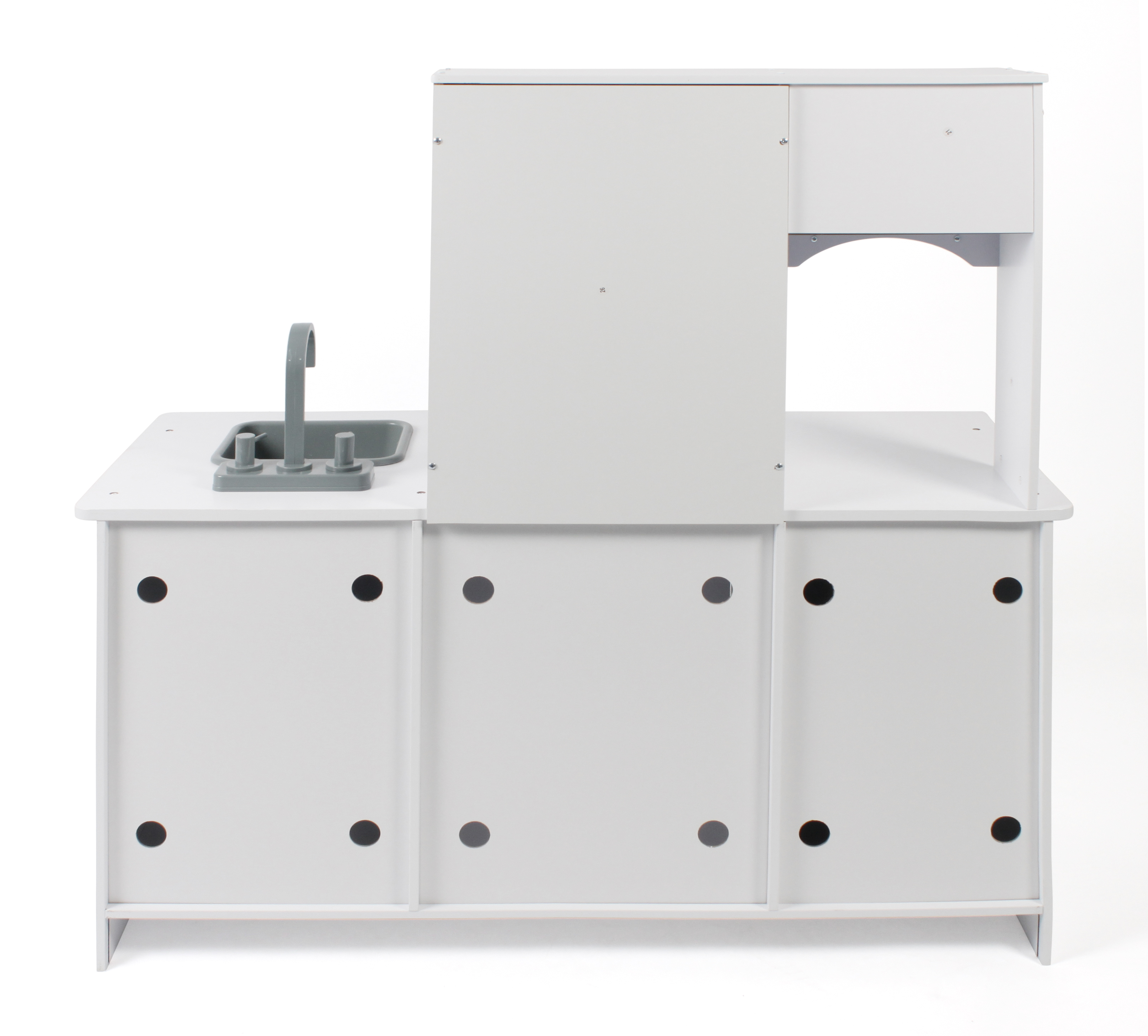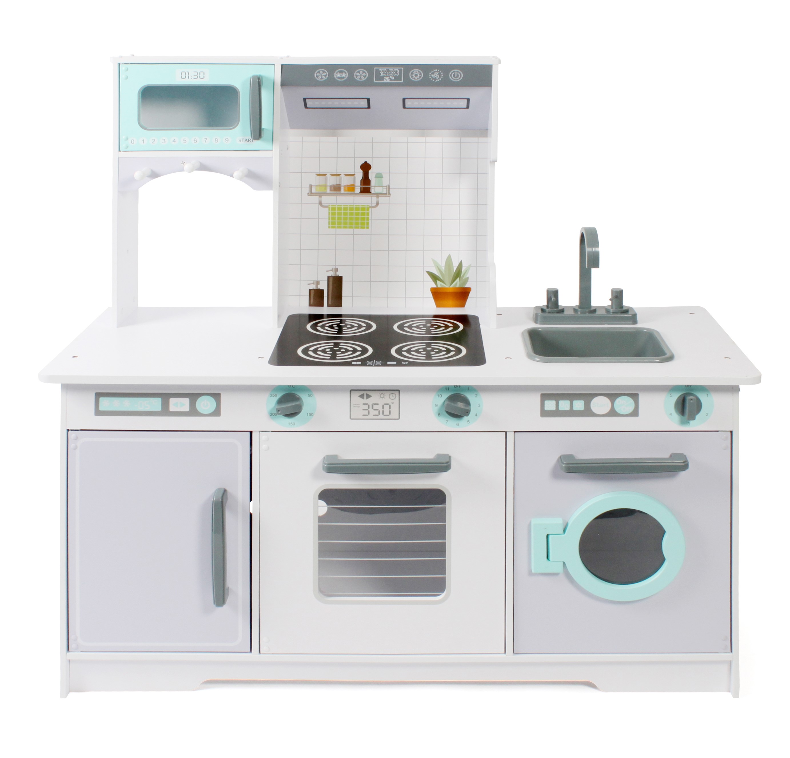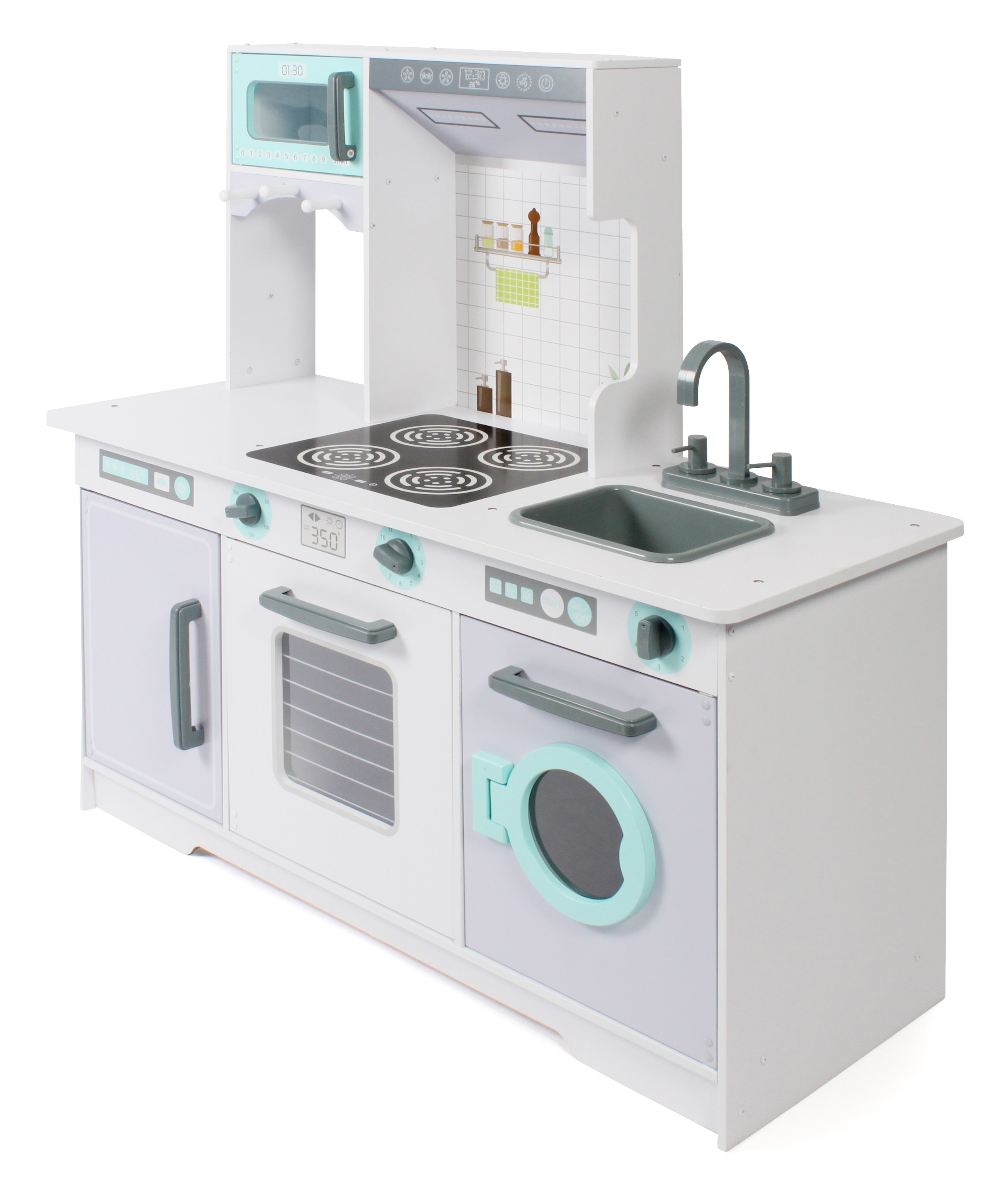 Mit dieser tollen Spielküche von Bayer CHIC 2000 haben Ihre Kinder besonders viel Spaß. Spielküchen fördern die Kreativität Ihrer Kinder und ermöglichen es Ihnen, Ihre Fantasie zu nutzen, um köstliche Gerichte für Ihre Gäste zu kochen. Das moderne Design ist ein echter Hingucker. Die wunderschöne Holzküche ist mit vier Herdplatten, einer Dunstabzugshaube, einer Mikrowelle mit Bedienfeld, einen großen Backofen, Kühlschrank, Waschmaschine und einem herausnehmbaren Spülbecken mit Armatur ausgestattet. Unter der Mikrowelle sind zudem drei Haken zum Anbringen von Kochutensilien angebracht. Die moderne Waschmaschine hat eine Klappe, die separat geöffnet werden kann, so dass jederzeit Wäsche nachgelegt werden kann. Die drei Drehknöpfe machen realistische Klick-Geräusche. Material: MDF, Kunststoff / Abmessungen: 96 x 37,5 x 96,5 cm; Höhe der Arbeitsplatte: 50,5 cm, Gewicht: 18 kg