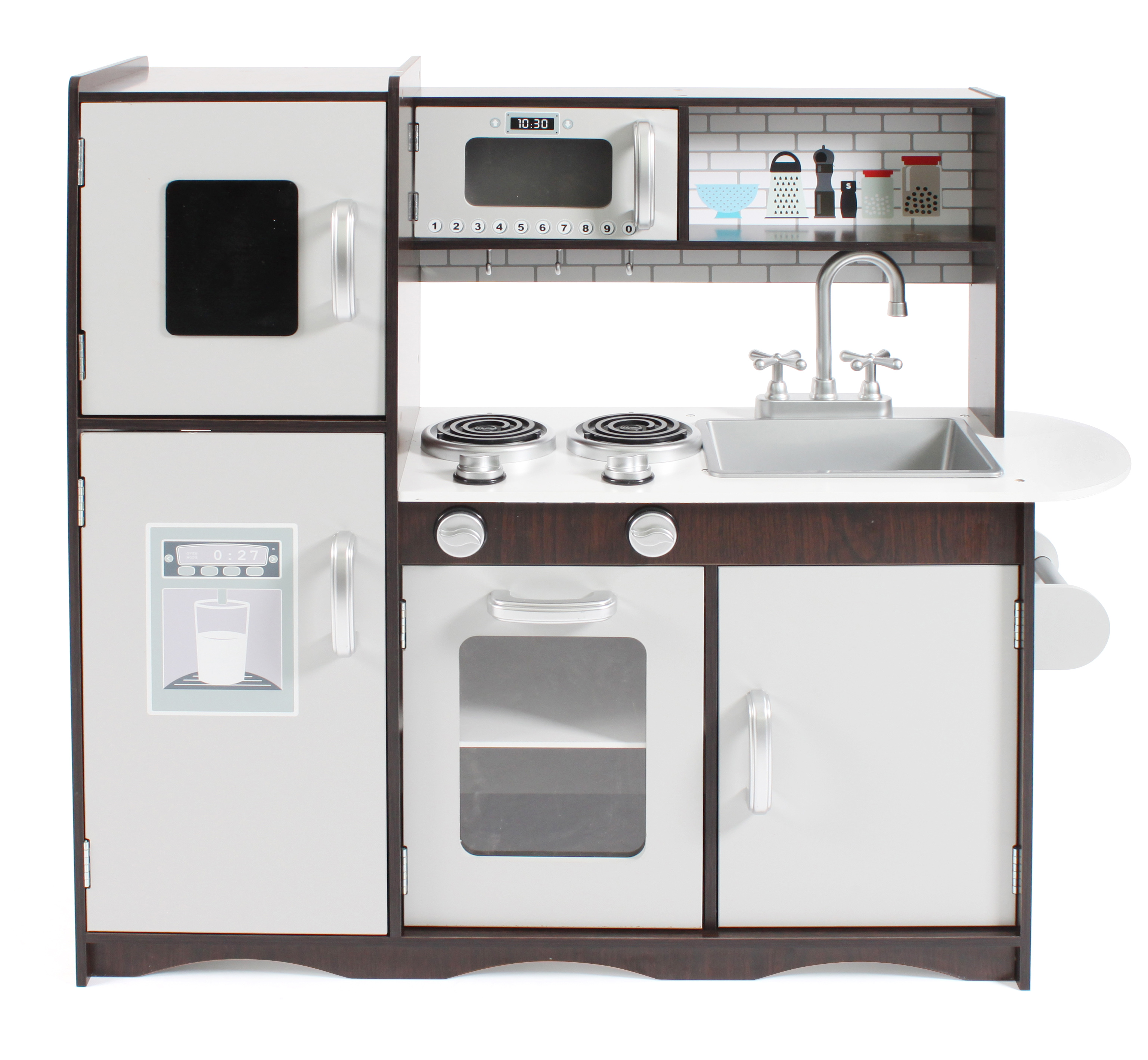 Mit dieser tollen Spielküche haben Ihre Kinder besonders viel Spaß. Die wunderschöne Spielküche beinhaltet einen Gefrierschrank mit einer Tafel zum Beschriften und Bemalen, einen Kühlschrank mit Aufdruck eines Ice-Makers, einem beweglichen Wasserhahn mit Spülbecken, geräumige Ablagefächer, einen großen Backofen mit Herdplatten und verstellbaren Reglern, eine Mikrowelle zum Öffnen sowie einen Handtuchhalter. Material: Holz, Kunststoff, Abmessungen: 91 x 30 x 82,5 cm; Höhe der Arbeitsplatte: 46 cm; Gewicht: 14,6 kg
