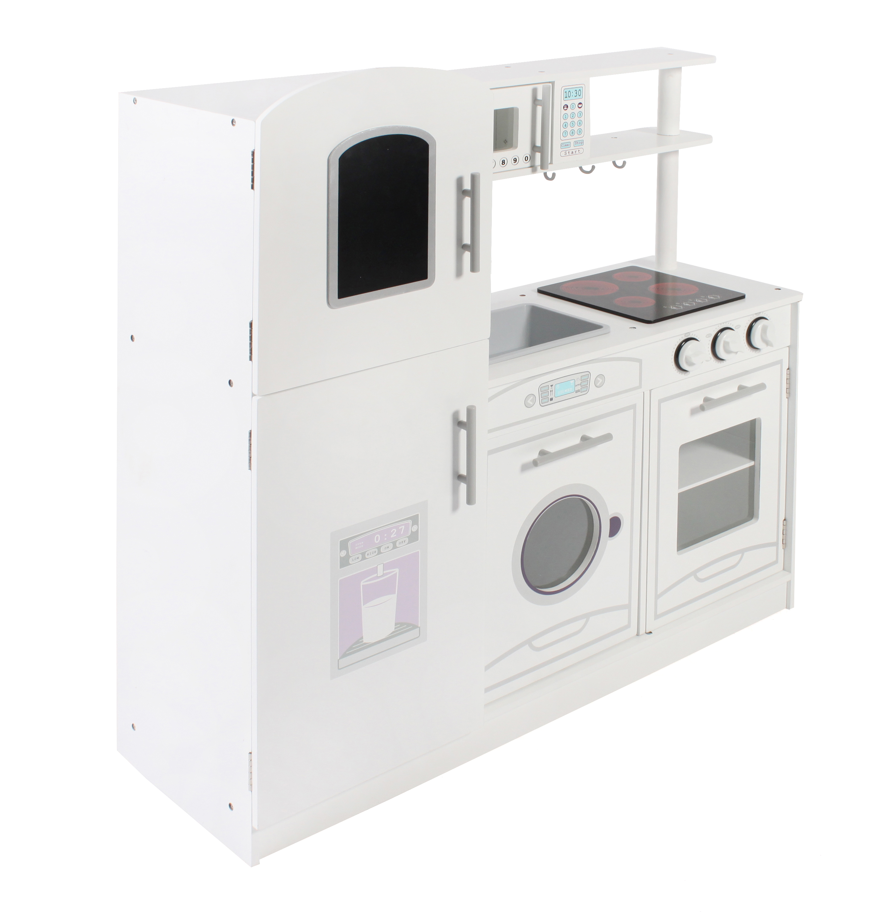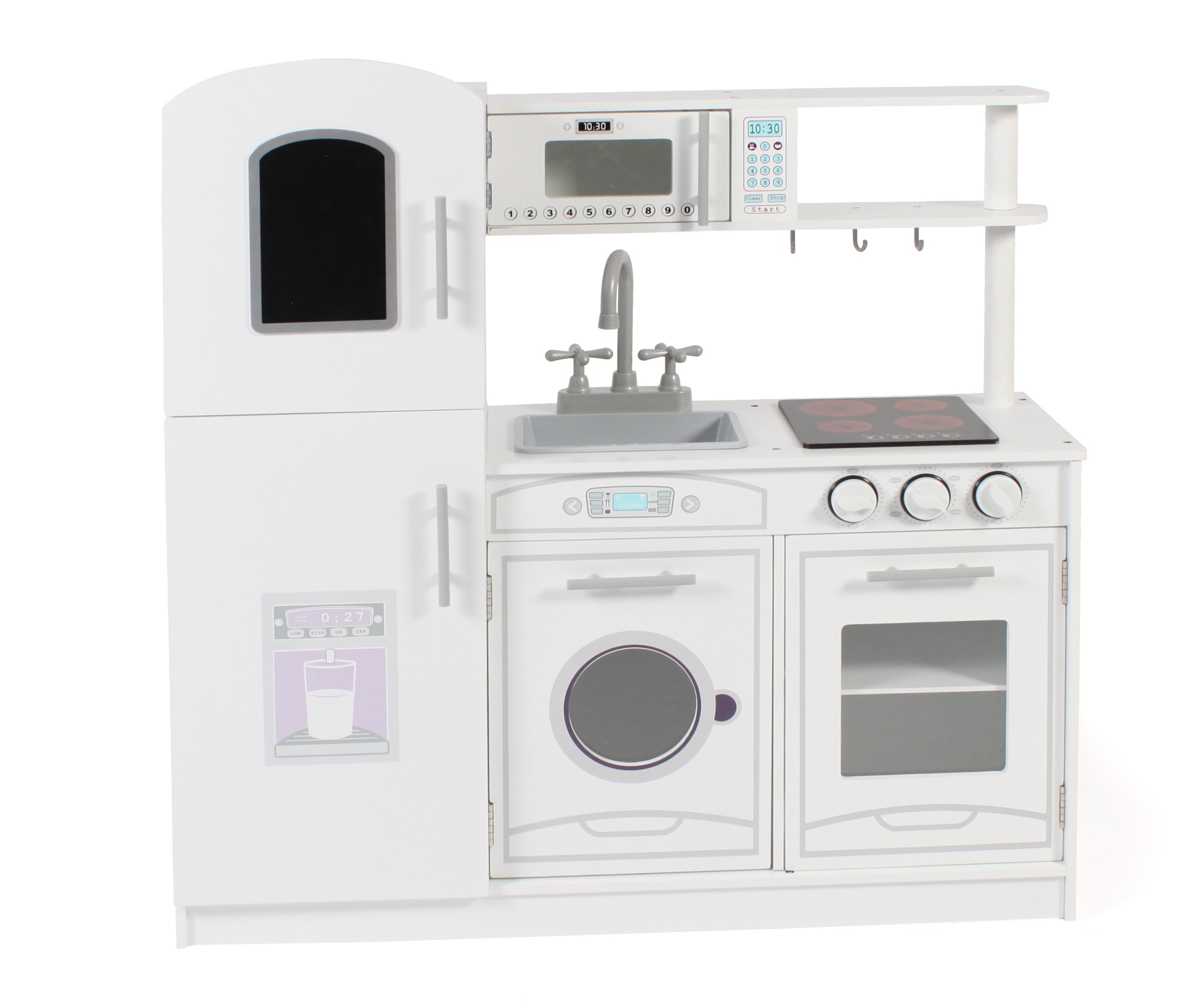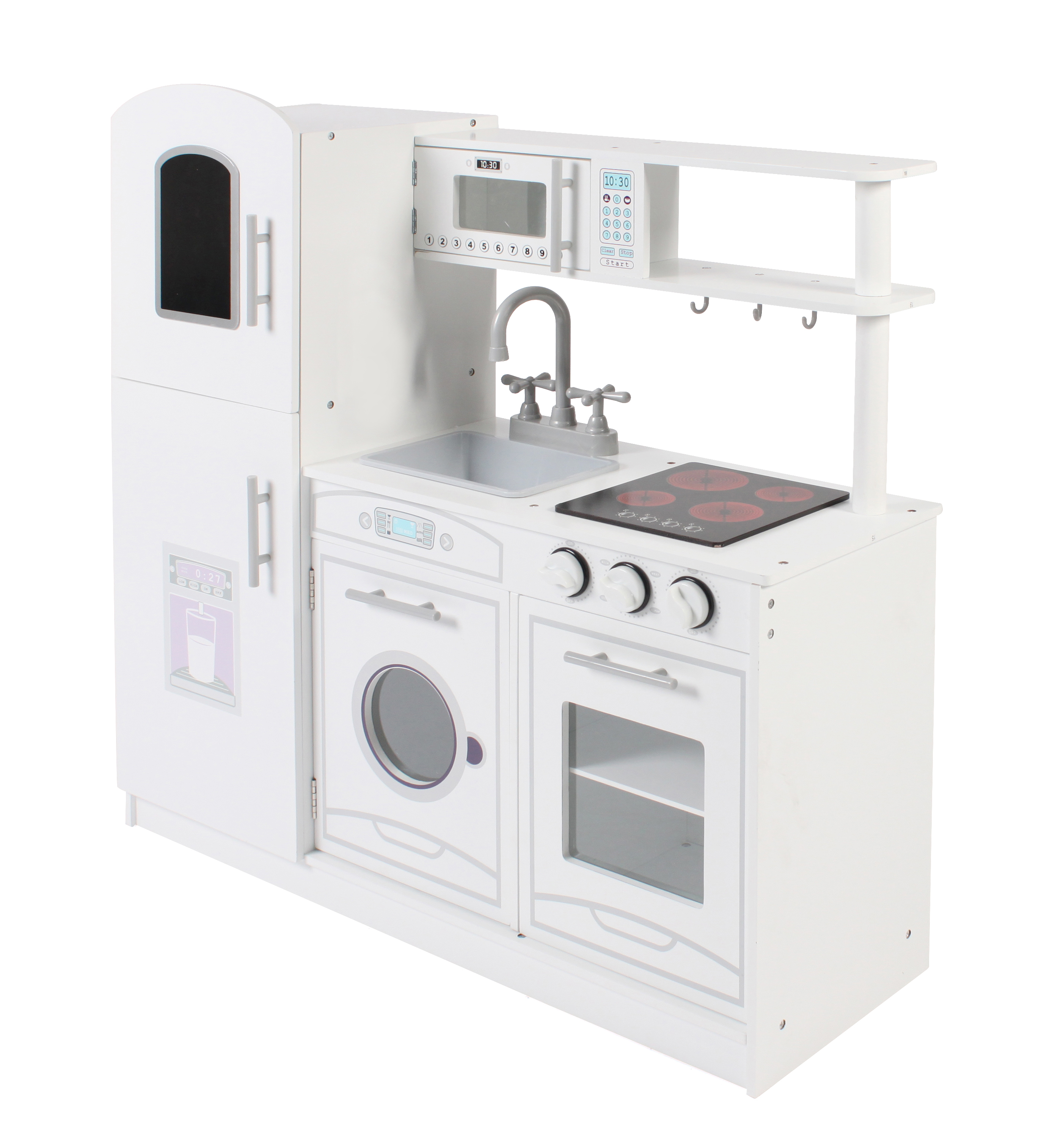 Mit dieser modernen Spielküche haben die kleinen Hobbyköche besonders viel Spaß. Die tolle Spielküche beinhaltet eine Kühl-Gefrier-Kombination mit Aufdruck eines Ice-Makers, um Besuchern ein erfrischendes Getränk anbieten zu können. Zur Ausstattung zählen ebenfalls ein beweglicher Wasserhahn mit Spülbecken, eine Spülmaschine, ein großer Backofen mit Herdplatten und verstellbaren Reglern, eine Mikrowelle zum Öffnen sowie ein Handtuchhalter. Material: Holz, Kunststoff, Abmessungen: 81,5 x 28,5 x 85 cm; Höhe der Arbeitsplatte: 46 cm; Gewicht: 13,9 kg