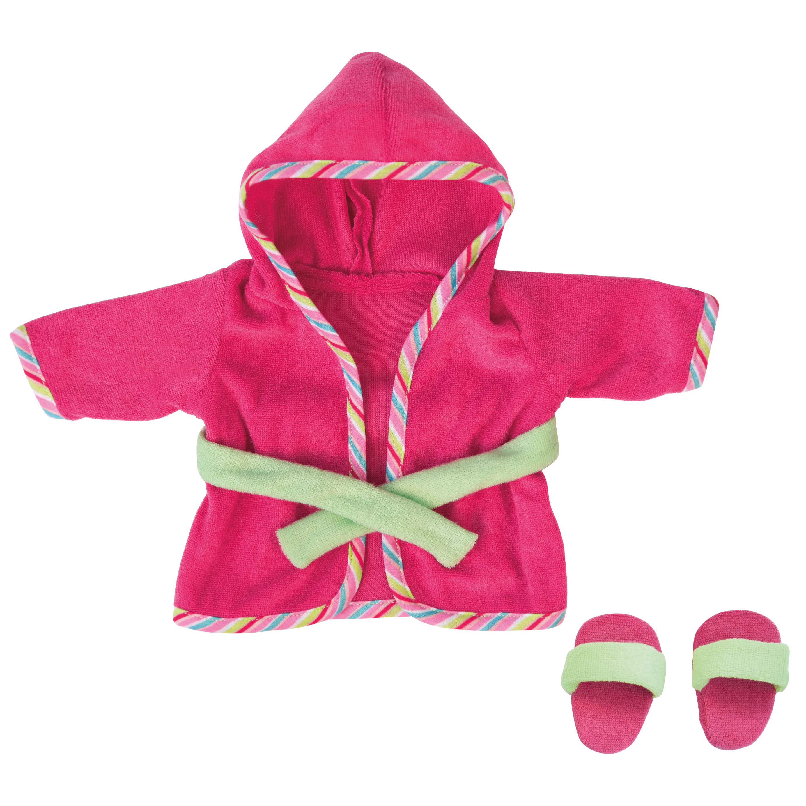 Schönes Puppen-Bademantel-Set Deluxe Dress, bestehend aus einem Bademantel mit Kapuze und Gürtel, sowie passenden Badeschlappen. Mit diesem modernen Outfit fühlt sich jede Puppe wohl. Passend für Puppen bis 38 cm. Lieferung erfolgt mit Kleiderbügel im Polybeutel.