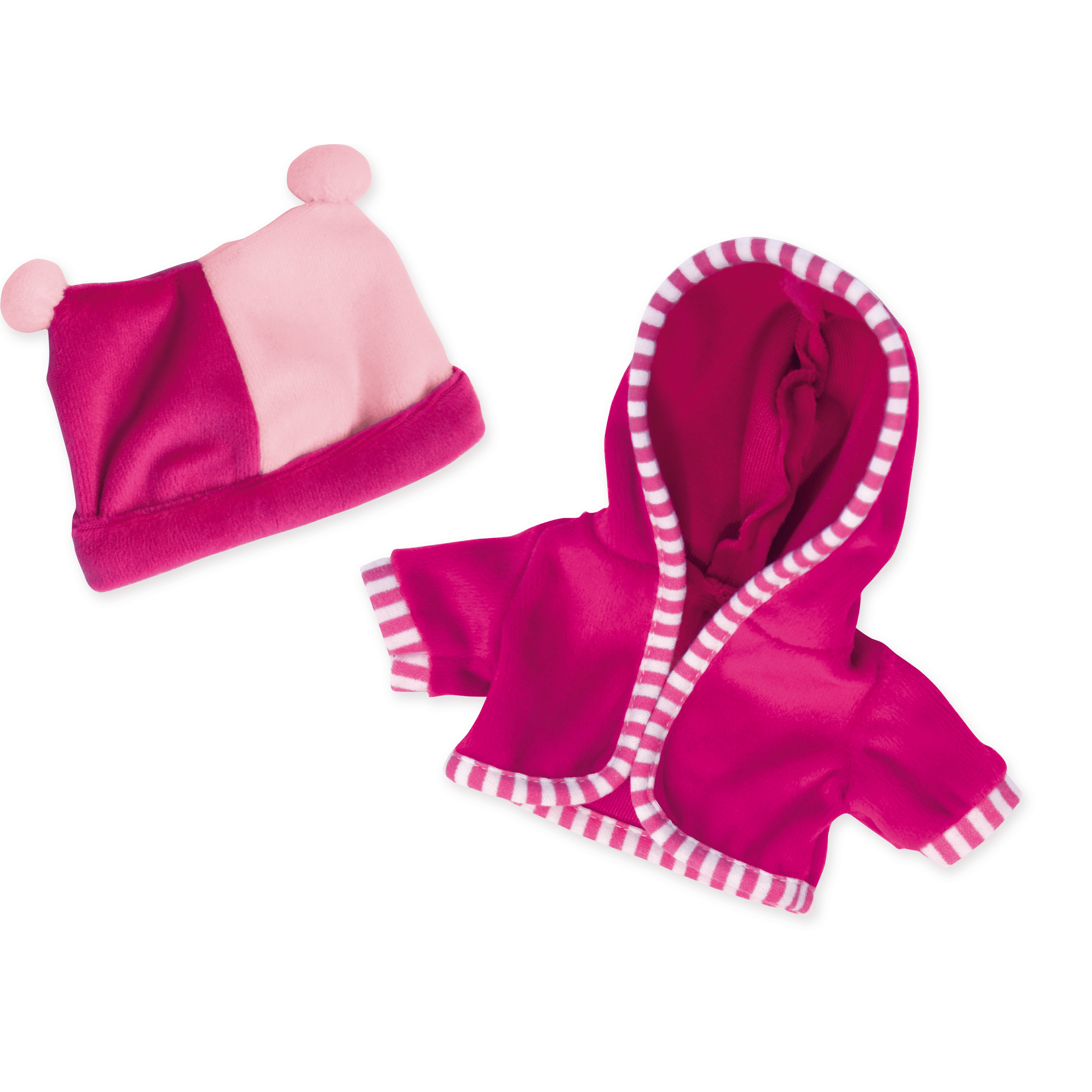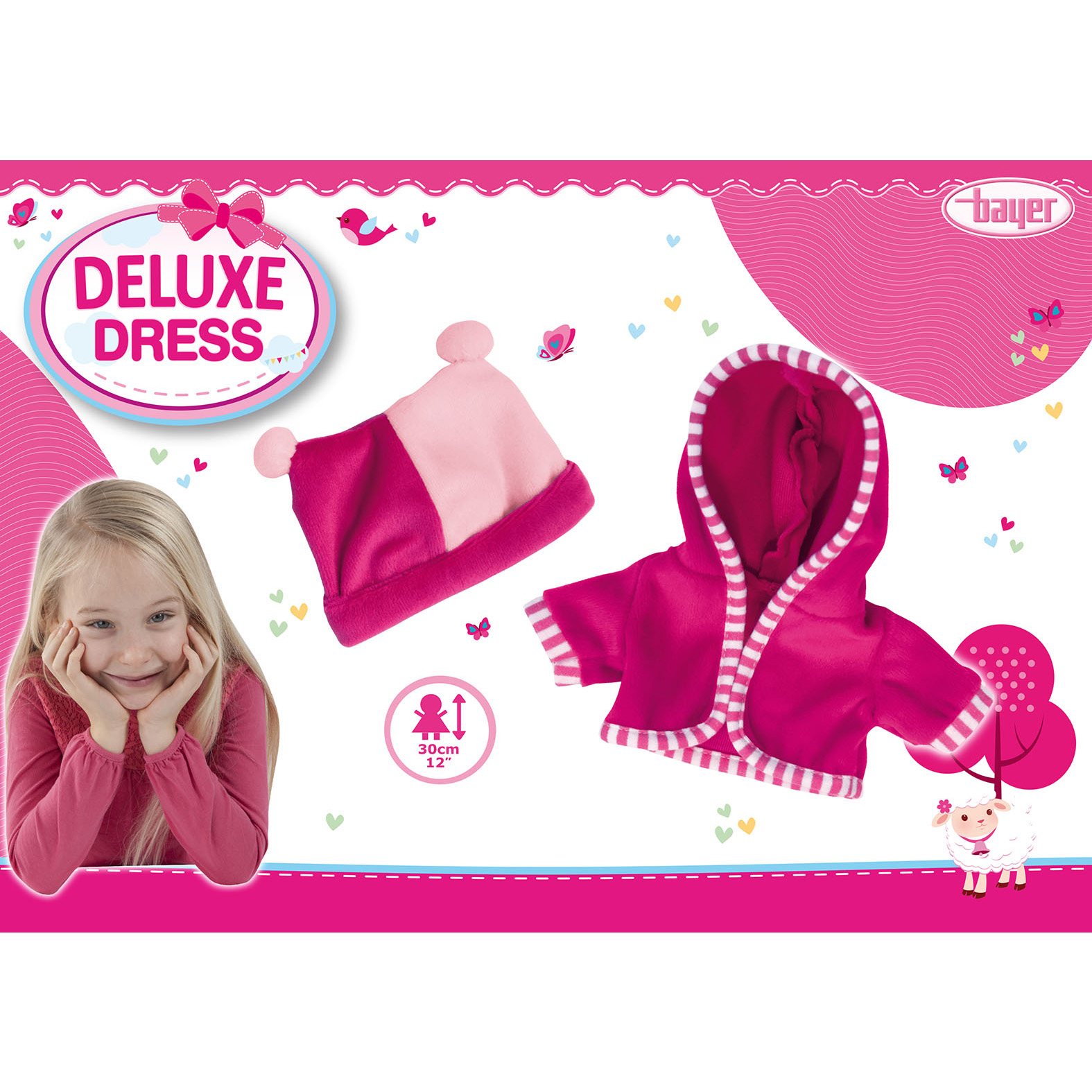 Schöne Puppenkleidung Deluxe Dress, bestehend aus einem süßen Jäckchen und einem passendem Mützchen mit Bommeln. Mit diesem modernen Outfit fühlt sich jede Puppe wohl. Passend für Puppen bis 30 cm. Lieferung erfolgt mit Kleiderbügel im Polybeutel.