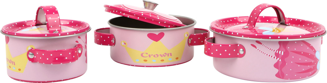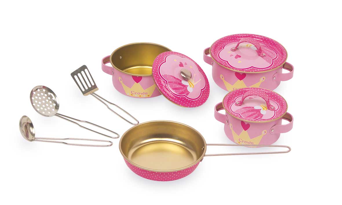 10-tlg. In seinem königlichen Design mit Elfen, Kronen und Herzen ist dieses 10-tlg. Set mit Pfanne, Töpfen und Küchenhelfern aus lackiertem Blech eine Zierde für jede Kinderküche!