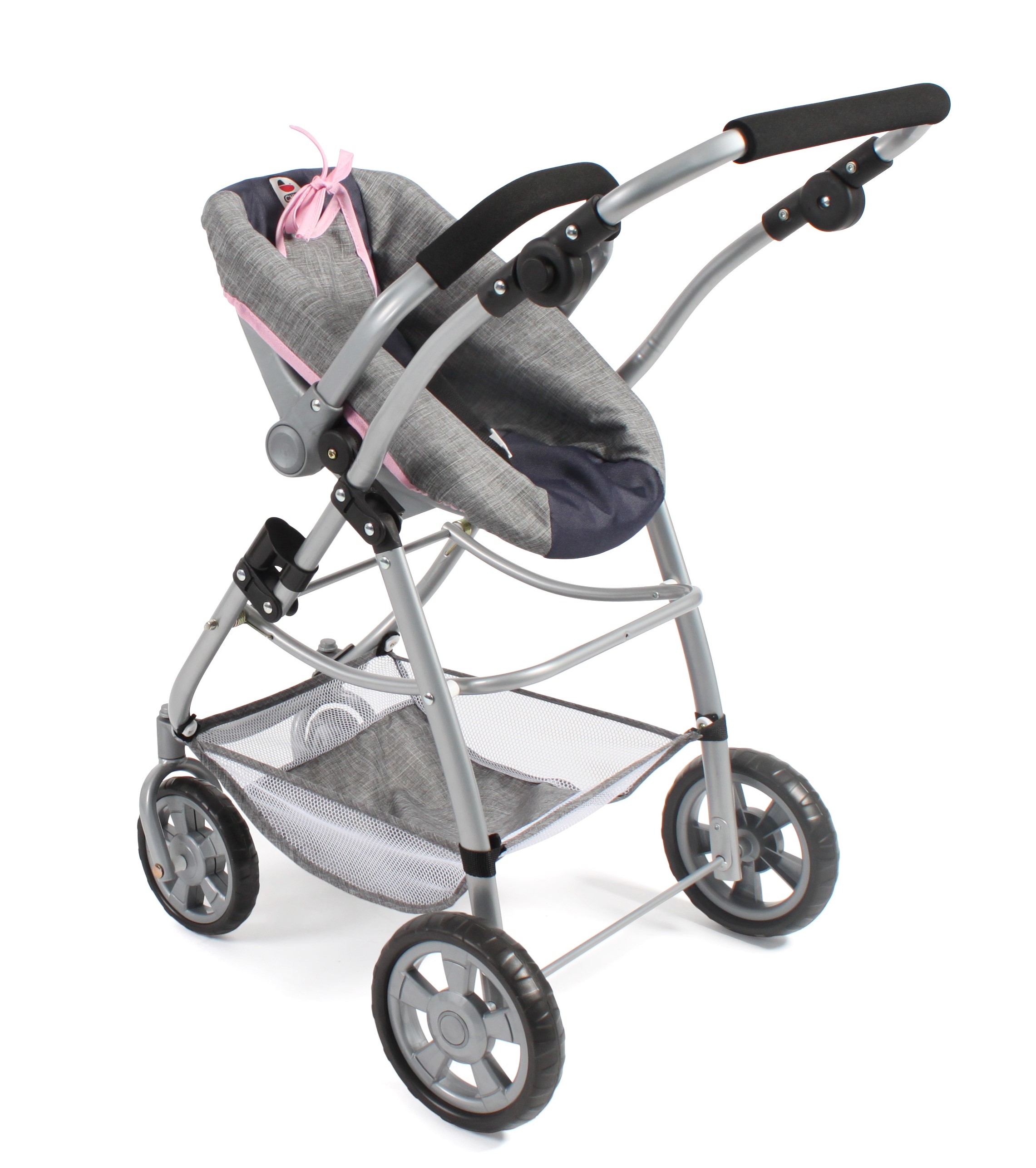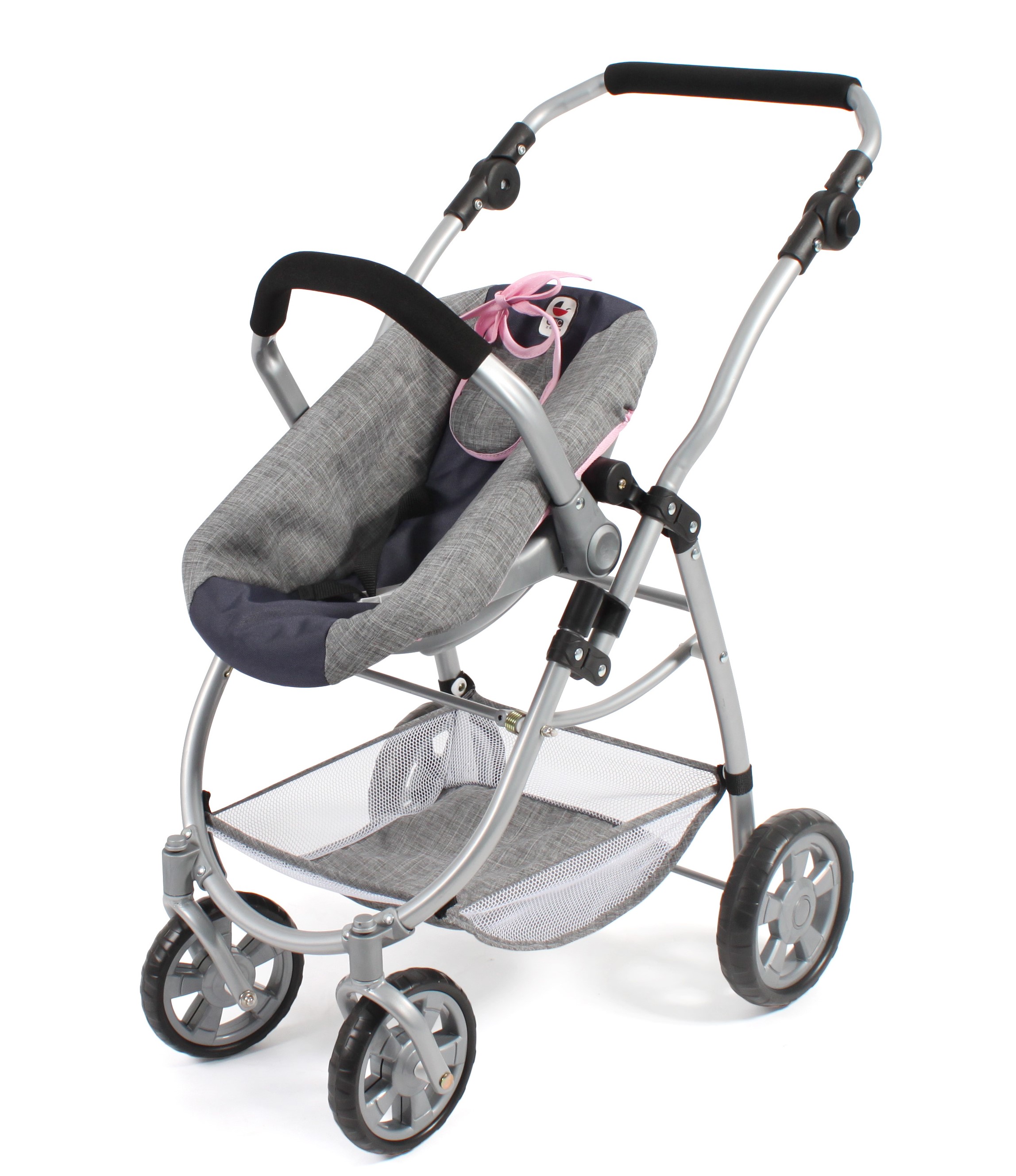 Bei dem Kombi-Puppenwagen EMOTION ALL IN kann sowohl eine Babywanne wie auch ein Puppen-Autositz und ein Sportwagenaufsatz auf das moderne Grundgestell aufgesetzt werden. Der Sportwagen ist mit einem 3-Punkt-Sicherheitsgurt ausgestattet und kann sowohl in Fahrtrichtung wie auch mit Blick zur Puppenmutti verwendet werden. Die Winddecke der Babywanne dient gleichzeitig als Beindecke für den Sportsitz. Kurven fahren wird zum Kinderspiel aufgrund der schwenkbaren Vorderräder. Der höhenverstellbare Schiebegriff von ca. 55 bis 82 cm passt sich jeder Körpergröße an. So ist ein dauerhaftes Spielvergnügen garantiert. Im großen Gepäcknetz kann alles notwendige Zubehör mittransportiert werden. Leicht zusammenklappbar. Für Puppen bis 52 cm geeignet. Artikelmaße: 67 x 43 x 77 cm; Gewicht: 6,2 kg