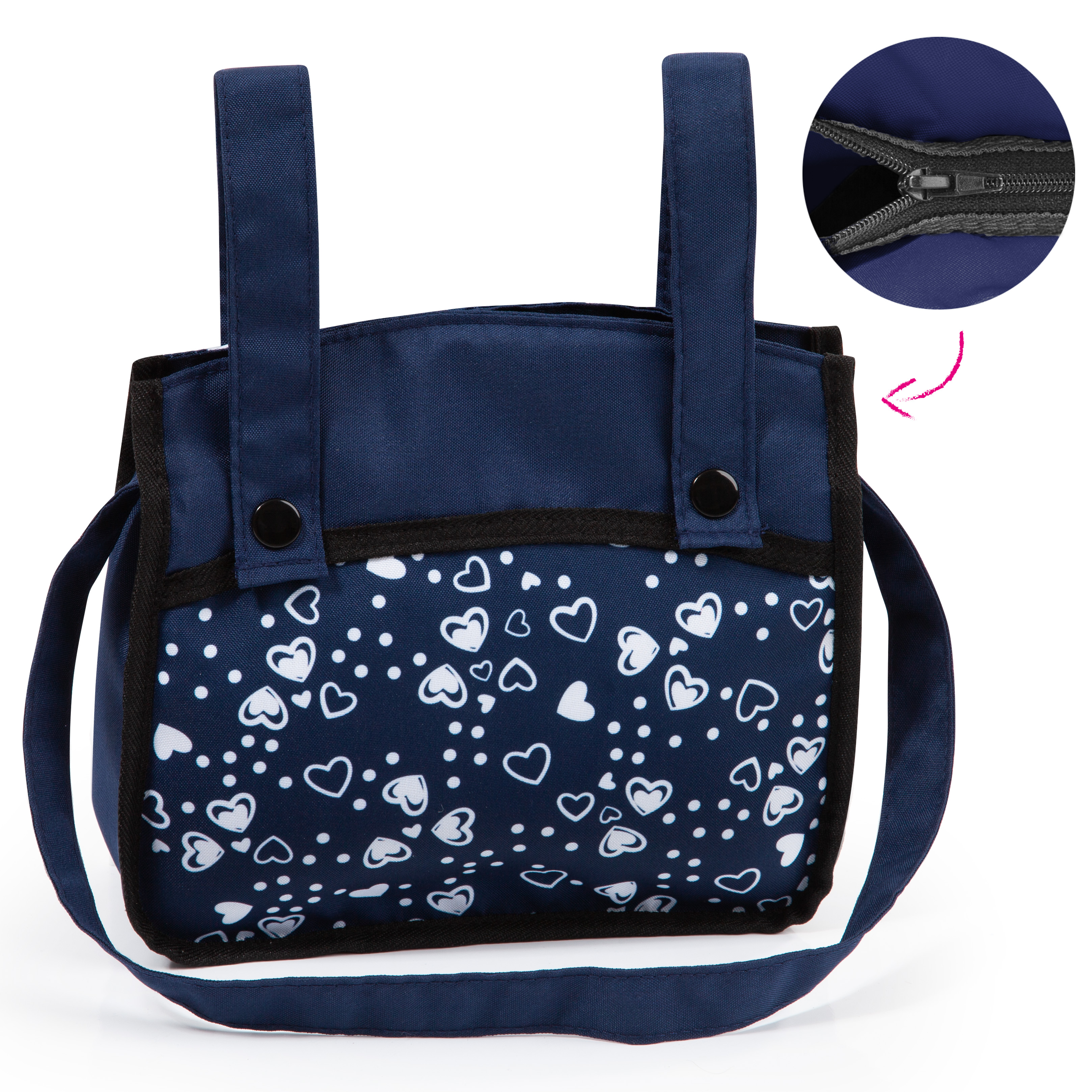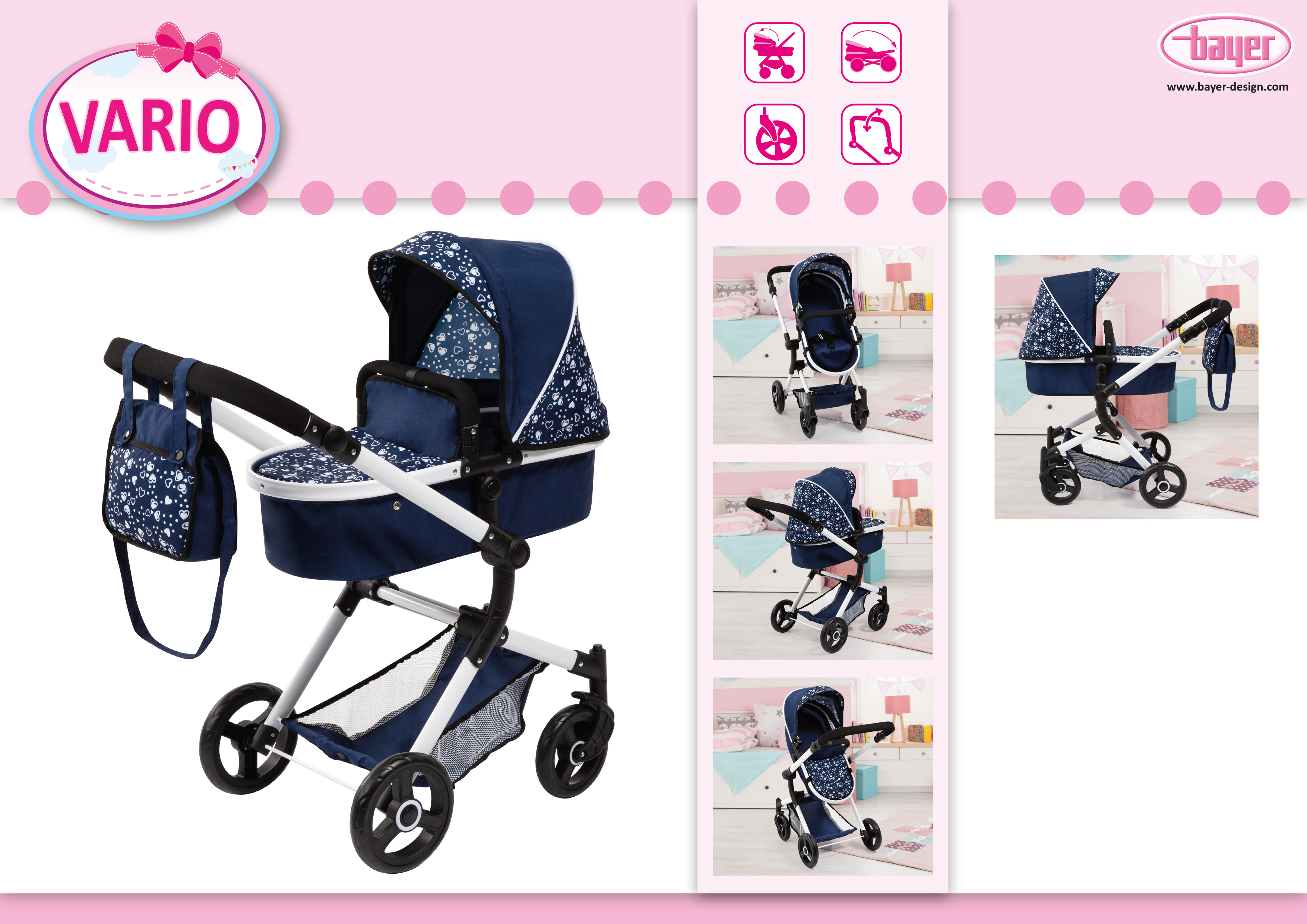 Vario ist ein moderner Kombi-Puppenwagen mit trendigem Design. In ihm können Puppen mit einer Größe von bis zu 52 cm mitgenommen werden. Durch seinen höhenverstellbaren Griff 62 - 79 cm kann er optimal auf die entsprechende Kindergröße angepasst werden. Die Wanne des Wagens kann in Fahrtrichtung als auch in Richtung des Kindes aufgesteckt werden. Außerdem ist der Schieber zu schwenken, so dass der Puppenwagen von beiden Seiten gefahren werden kann. Zudem kann die Wanne durch Druckknöpfe und durch die einfache Positionswandlung leicht zu einem Sportsitz umfunktioniert werden, der ebenfalls auf beide Seiten zeigen kann. Die Abdeckung der Wanne ist ideal, um die Puppe sowohl in liegender Position als auch in sitzender Position vor Witterungseinflüssen wie Sonne oder Wind zu schützen. Der Wagen besitzt unter anderem schwenkbare Vorderräder, die eine besonders leichte Kurvenfahrt ermöglichen. Für den Transport lässt sich der Puppenwagen Vario einfach zusammenklappen. Die mitgelieferte Tasche ist farblich auf den Wagen abgestimmt. Sie besitzt einen Reißverschluß zum Verschluß der Tasche und kann als Umhängetasche (langer Henkel) als auch als Handtasche - 2 kurze Henkel sind zusätzlich vorhanden - genutzt werden. Neben der Tasche bietet auch der im Vario integrierte Korb viel Platz für weitere Spielutensilien.