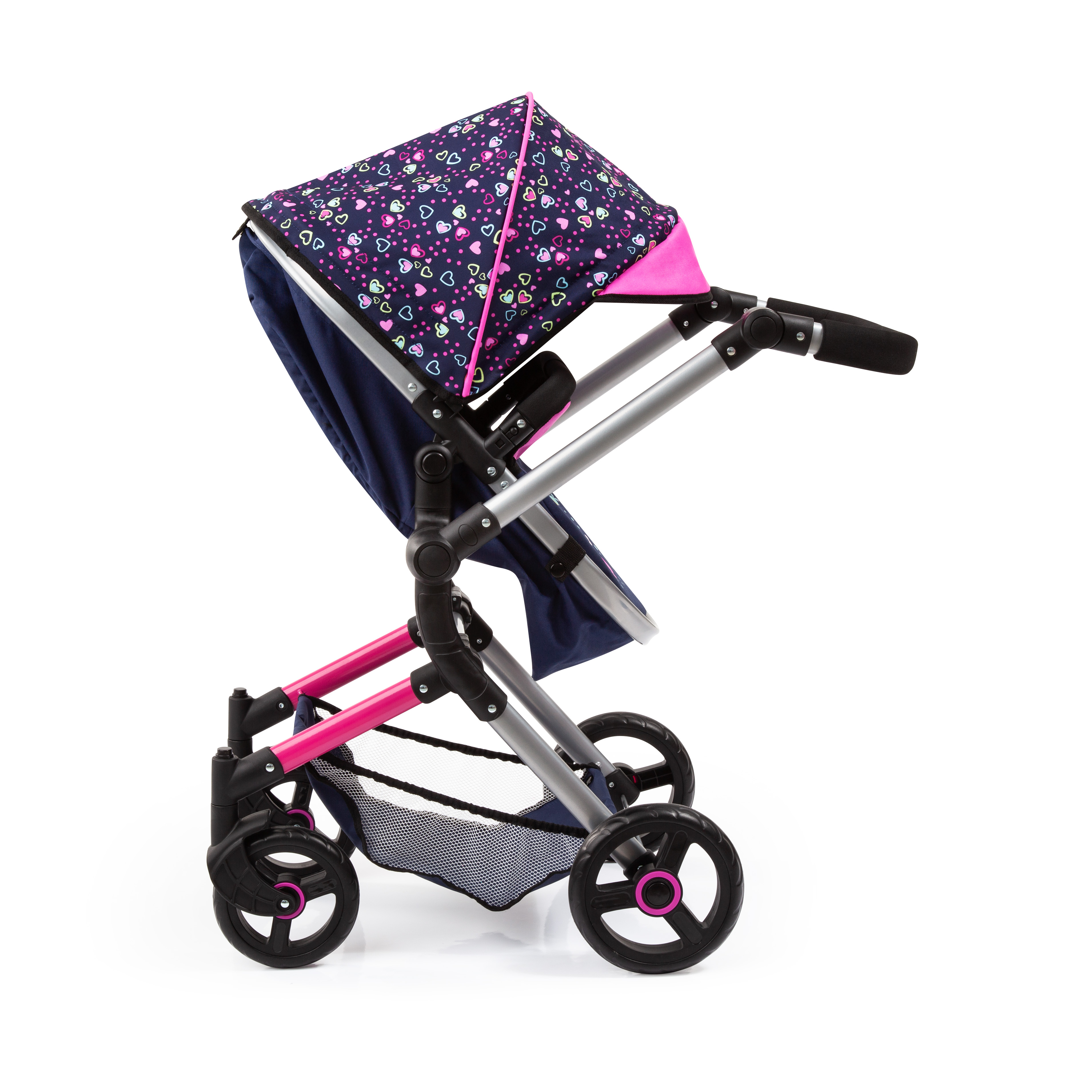 Neo Vario ist ein moderner Kombi-Puppenwagen mit trendigem Design. In ihm können Puppen mit einer Größe von bis zu 52 cm mitgenommen werden. Durch seinen höhenverstellbaren Griff 62 - 79 cm kann er optimal auf die entsprechende Kindergröße angepasst werden. Die Wanne des Wagens kann in Fahrtrichtung als auch in Richtung des Kindes aufgesteckt werden. Außerdem ist der Schieber zu schwenken, so dass der Puppenwagen von beiden Seiten gefahren werden kann. Zudem kann die Wanne durch Druckknöpfe und durch die einfache Positionswandlung leicht zu einem Sportsitz umfunktioniert werden, der ebenfalls auf beide Seiten zeigen kann. Die Abdeckung der Wanne ist ideal, um die Puppe sowohl in liegender Position als auch in sitzender Position vor Witterungseinflüssen wie Sonne oder Wind zu schützen. Der Wagen besitzt unter anderem schwenkbare Vorderräder, die eine besonders leichte Kurvenfahrt ermöglichen. Für den Transport lässt sich der Puppenwagen Vario einfach zusammenklappen. Die mitgelieferte Tasche ist farblich auf den Wagen abgestimmt. Sie besitzt einen Reißverschluß zum Verschluß der Tasche und kann als Umhängetasche (langer Henkel) als auch als Handtasche - 2 kurze Henkel sind zusätzlich vorhanden - genutzt werden. Neben der Tasche bietet auch der im Vario integrierte Korb viel Platz für weitere Spielutensilien.