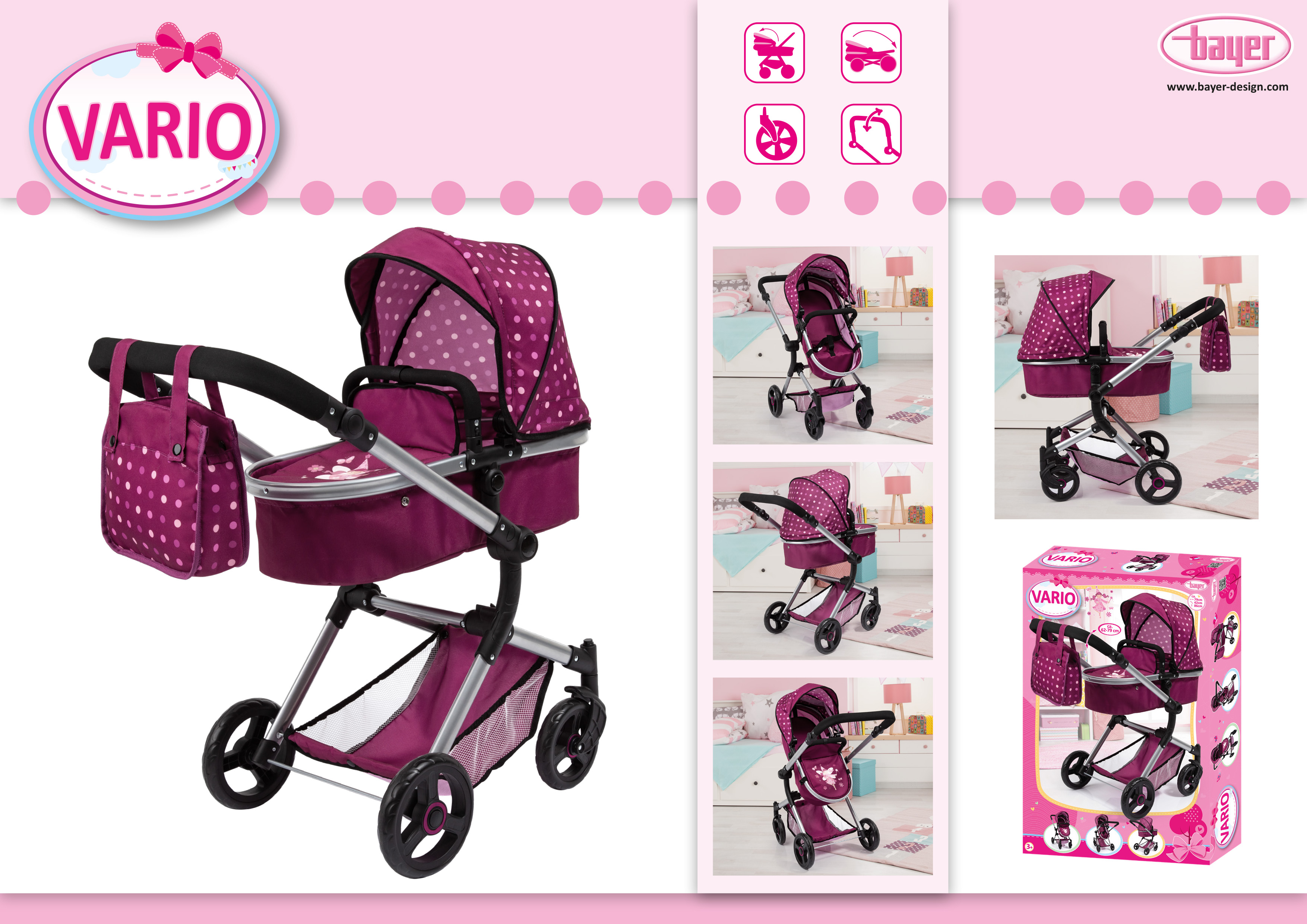 Vario ist ein moderner Kombi-Puppenwagen mit trendigem Design. In ihm können Puppen mit einer Größe von bis zu 52 cm mitgenommen werden. Durch seinen höhenverstellbaren Griff 62 - 79 cm kann er optimal auf die entsprechende Kindergröße angepasst werden. Die Wanne des Wagens kann in Fahrtrichtung als auch in Richtung des Kindes aufgesteckt werden. Außerdem ist der Schieber zu schwenken, so dass der Puppenwagen von beiden Seiten gefahren werden kann. Zudem kann die Wanne durch Druckknöpfe und durch die einfache Positionswandlung leicht zu einem Sportsitz umfunktioniert werden, der ebenfalls auf beide Seiten zeigen kann. Die Abdeckung der Wanne ist ideal, um die Puppe sowohl in liegender Position als auch in sitzender Position vor Witterungseinflüssen wie Sonne oder Wind zu schützen. Der Wagen besitzt unter anderem schwenkbare Vorderräder, die eine besonders leichte Kurvenfahrt ermöglichen. Für den Transport lässt sich der Puppenwagen Vario einfach zusammenklappen. Die mitgelieferte Tasche ist farblich auf den Wagen abgestimmt. Sie besitzt einen Reißverschluß zum Verschluß der Tasche und kann als Umhängetasche (langer Henkel) als auch als Handtasche - 2 kurze Henkel sind zusätzlich vorhanden - genutzt werden. Neben der Tasche bietet auch der im Vario integrierte Korb viel Platz für weitere Spielutensilien.