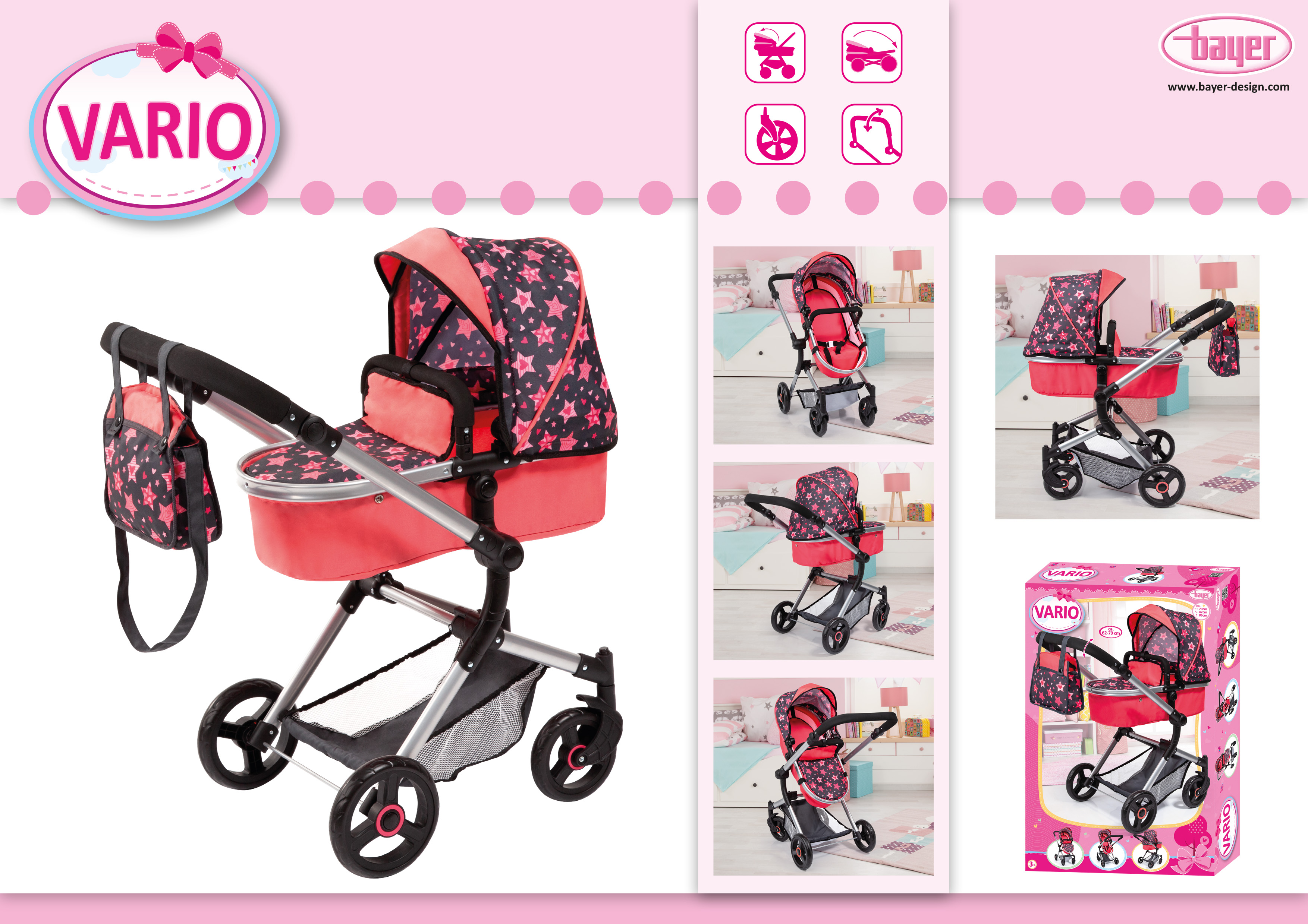 Vario ist ein moderner Kombi-Puppenwagen mit trendigem Design. In ihm können Puppen mit einer Größe von bis zu 52 cm mitgenommen werden. Durch seinen höhenverstellbaren Griff 62 - 79 cm kann er optimal auf die entsprechende Kindergröße angepasst werden. Die Wanne des Wagens kann in Fahrtrichtung als auch in Richtung des Kindes aufgesteckt werden. Außerdem ist der Schieber zu schwenken, so dass der Puppenwagen von beiden Seiten gefahren werden kann. Zudem kann die Wanne durch Druckknöpfe und durch die einfache Positionswandlung leicht zu einem Sportsitz umfunktioniert werden, der ebenfalls auf beide Seiten zeigen kann. Die Abdeckung der Wanne ist ideal, um die Puppe sowohl in liegender Position als auch in sitzender Position vor Witterungseinflüssen wie Sonne oder Wind zu schützen. Der Wagen besitzt unter anderem schwenkbare Vorderräder, die eine besonders leichte Kurvenfahrt ermöglichen. Für den Transport lässt sich der Puppenwagen Vario einfach zusammenklappen. Die mitgelieferte Tasche ist farblich auf den Wagen abgestimmt. Sie besitzt einen Reißverschluß zum Verschluß der Tasche und kann als Umhängetasche (langer Henkel) als auch als Handtasche - 2 kurze Henkel sind zusätzlich vorhanden - genutzt werden. Neben der Tasche bietet auch der im Vario integrierte Korb viel Platz für weitere Spielutensilien.