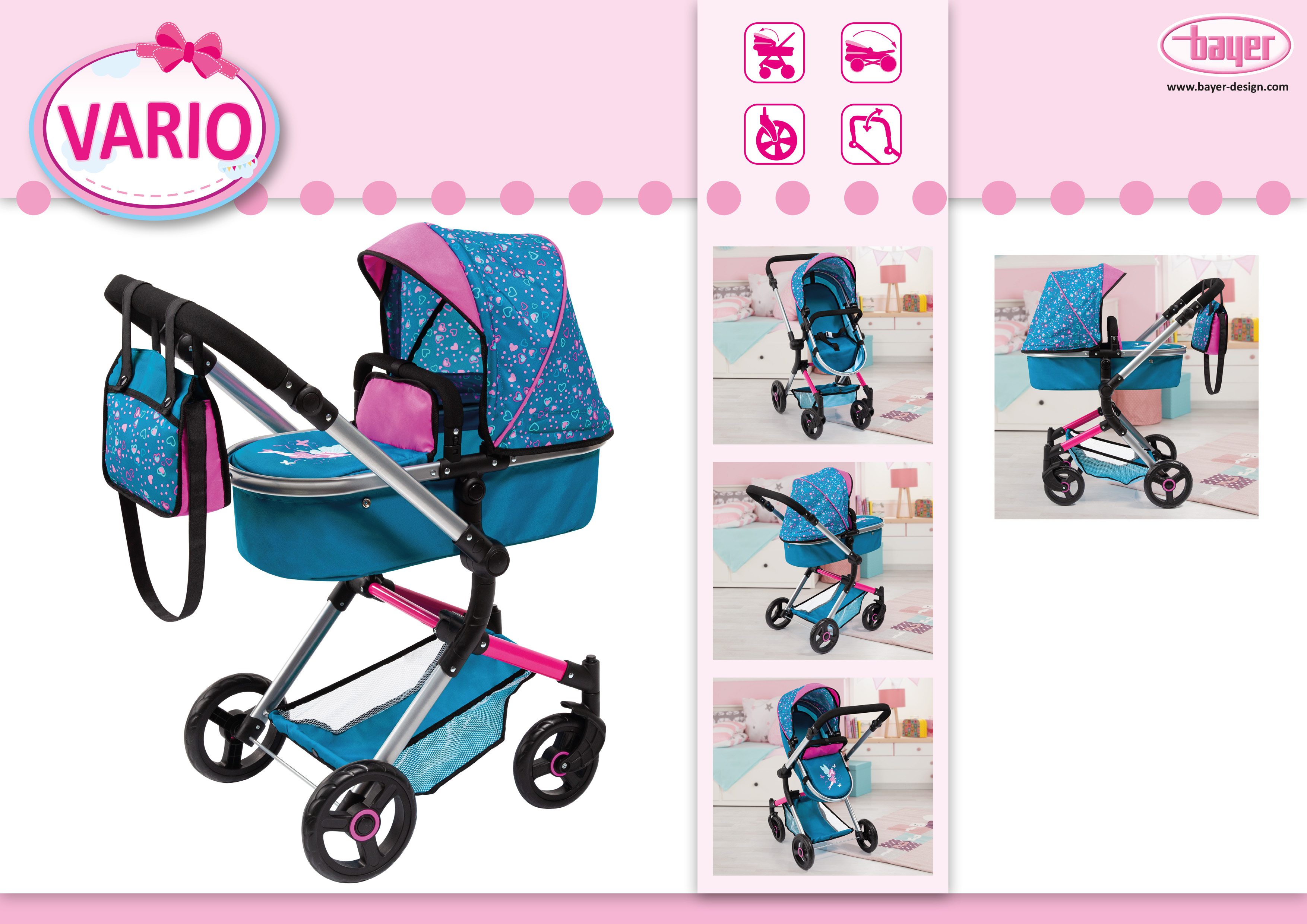 Neo Vario ist ein moderner Kombi Puppenwagen im trendy Design mit vielen Spielmöglichkeiten auch für große Kinder. In ihm können große Puppen mit einer Größe von bis zu 52 cm mitgenommen werden. Durch seinen höhenverstellbaren Griff 62 - 79 cm kann er optimal auf die entsprechende Kindergröße von z.B. 3 bis 6 oder 7 Jahren angepasst werden. Die Wanne des Wagens kann in Fahrtrichtung als auch in Richtung des Kindes aufgesteckt werden. Außerdem ist der Schieber zum Schwenken, so dass der Puppenwagen von beiden Seiten gefahren werden kann. Zudem kann die Wanne durch Druckknöpfe und durch die einfache Positionswandlung leicht zu einem modernen Sportwagen oder stabilen Puppenjogger umfunktioniert werden. Die Abdeckung der Wanne ist ideal, um die Puppe sowohl in liegender Position als auch in sitzender Position vor Witterungseinflüssen wie Sonne oder Wind zu schützen. Schwenkbare Vorderräder im modernen 2-farbigen Look machen ihn besonders wendig. Die mitgelieferte hochwertige Wickeltasche oder Einkaufstasche ist farblich auf den Wagen abgestimmt. Sie besitzt einen Reißverschluss zum Verschließen und kann sowohl als Umhängetasche (langer Henkel) oder auch als Handtasche - (2 kurze Henkel sind zusätzlich vorhanden) - genutzt werden. Neben der Tasche bietet auch der im Vario integrierte Ablagekorb bzw. Einkaufskorb viel Platz für weitere Spielutensilien. Für den Transport lässt sich der Puppenwagen Vario sehr einfach zusammenklappen.