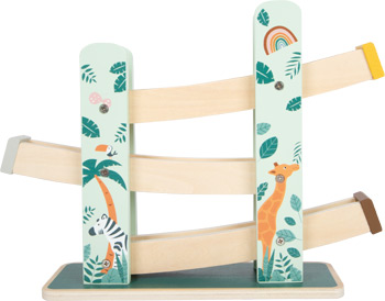 Mit Schwung durch die Wildnis! Auf dieser Kugelbahn aus Holz im angesagten „Safari“-Look rasen drei verschieden farbige und mit Mustern verzierte Holzräder die drei Rampen hinunter. Die Abfahrt ist mit Safari-Tieren und trendigen Blätter-Motiven detailreich verziert. Ausdauernder Spielspaß vorprogrammiert! Ein echter Hingucker und Anziehungspunkt für jedes Kinderzimmer! Besonders standfest durch breiten Standfuß!