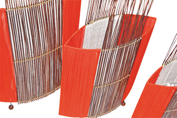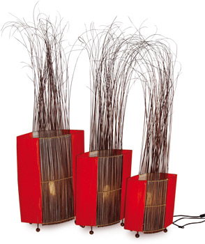 3-er Set. Dekorative Leuchten aus naturbelassenen Zweigen und roten sowie weißen Textilbahnen. Ob zum Lesen oder Entspannen - je nach Helligkeit der verwendeten Glühlampen geben die Lampen helles und auch, durch die Textilien gedämpft, angenehmes Licht. Die nach oben offenen Zweige und die kleinen Kugelfüße bringen eine ruhige Leichtigkeit in den Raum. Lieferung ohne Leuchtmittel!