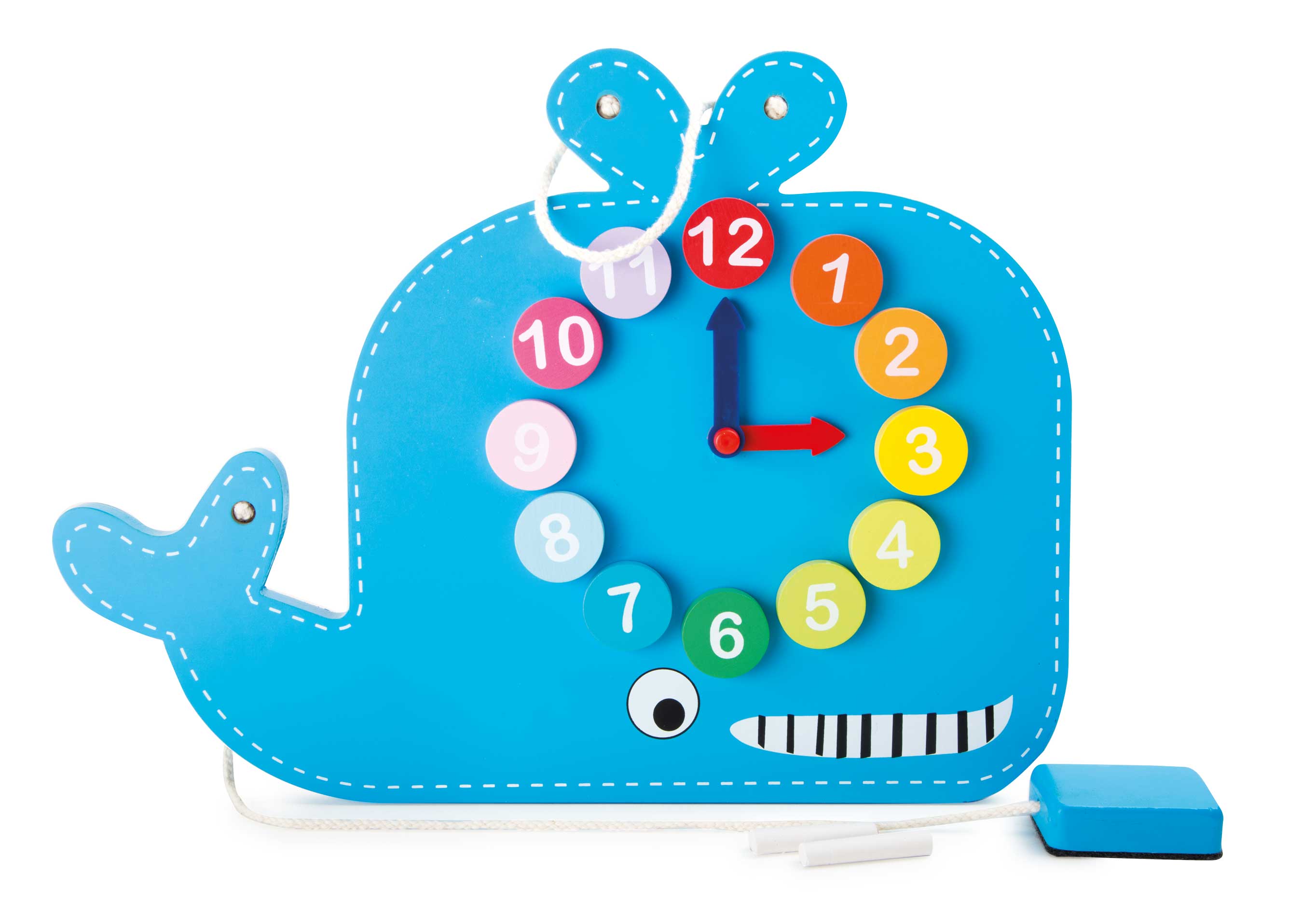 Bei dieser Lernuhr kommen Unterwasserfans auf ihre Kosten. Auf dem großen Wal kann die Uhrzeit erlernt werden. Auf der Rückseite befindet sich eine Tafel, in der die Zeiger eingezeichnet werden müssen. Kreide und Schwamm sind hier behilflich.